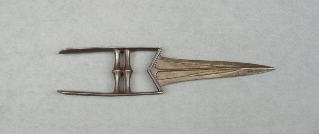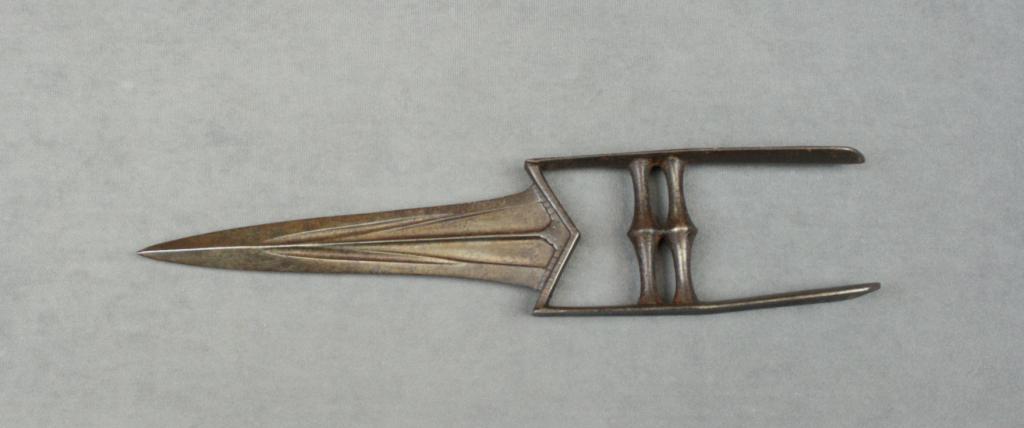 Eighteenth or Nineteenth century forged iron armor piercing metal Katar approx. 14” overall with an approx. 8” pointed blade showing a heavy dark patina in overall good, uncleaned condition. Est.: $150-$300.