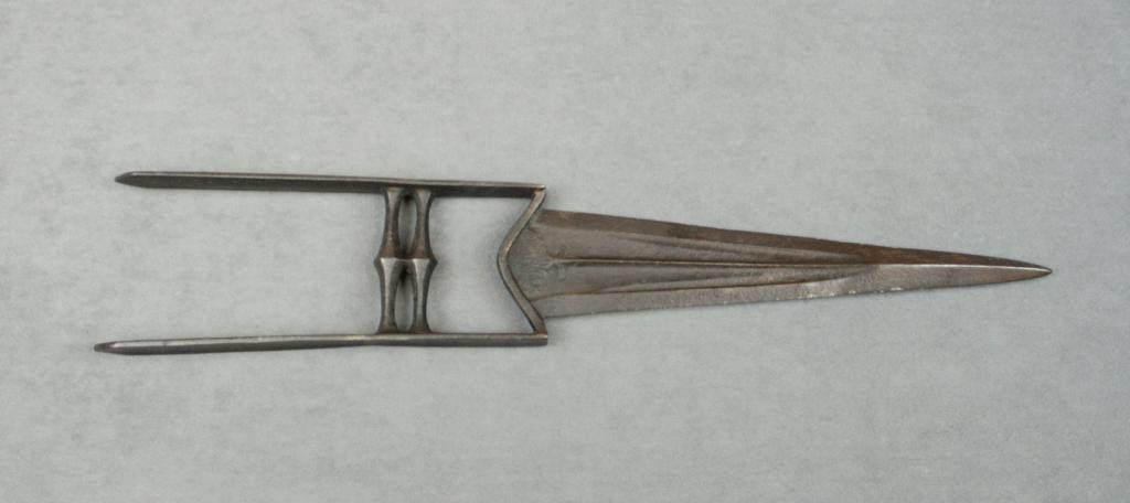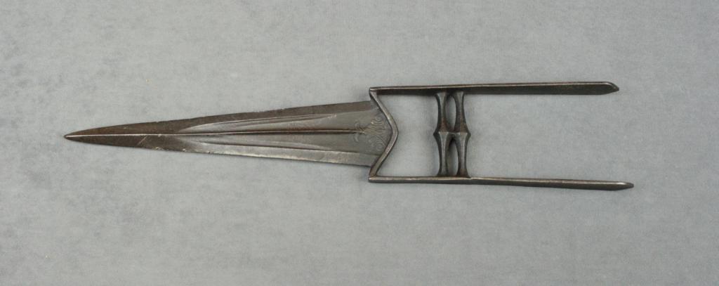 Eighteenth or Nineteenth century forged iron armor piercing metal Katar approx. 19” overall with an approx. 10” pointed blade showing a heavy dark patina with floral design at the hilt areas of the blade; inoverall uncleaned good condition. Est.: $150-$300.