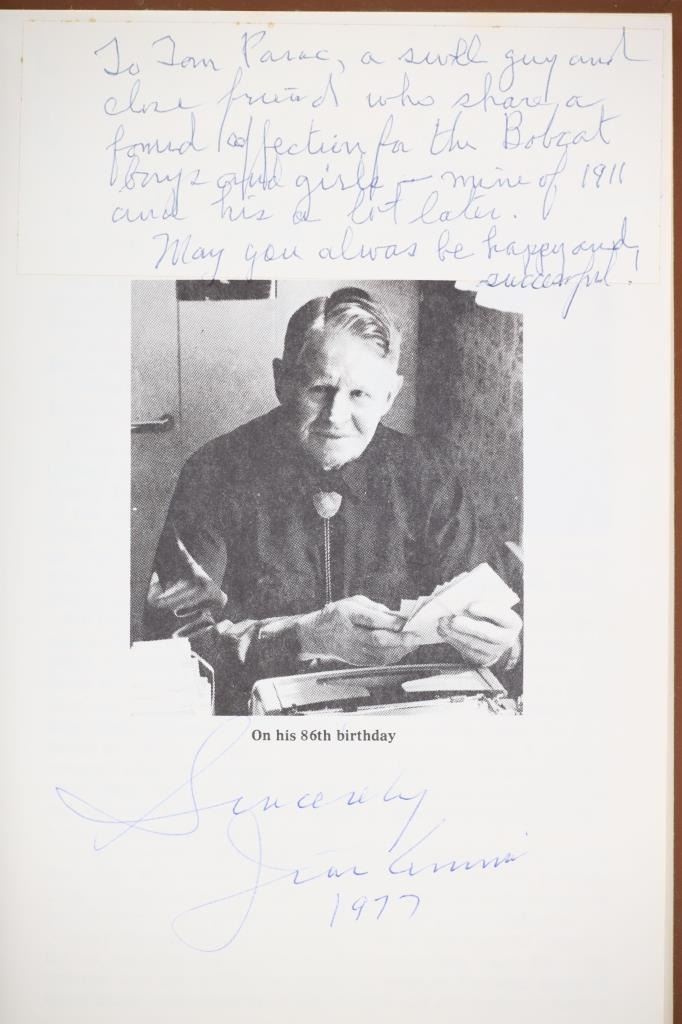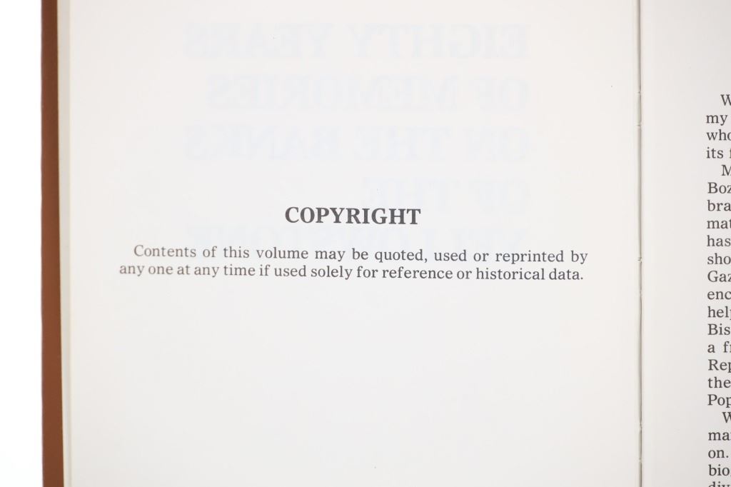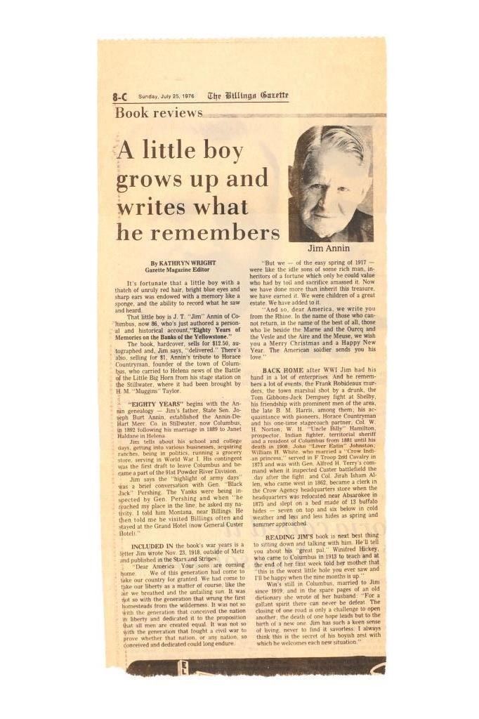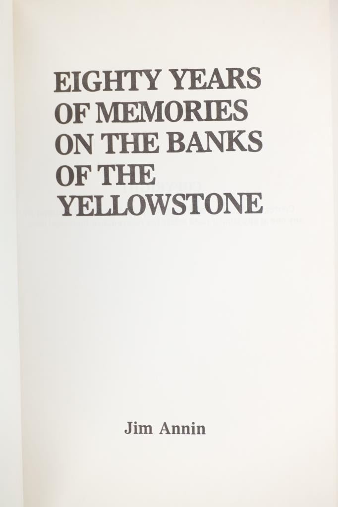 For your consideration is this signed book titled, "Eighty Years of Memories on the Banks of the Yellowstone" by Montana author Jim Annin circa 1977. The book is a memoir of stories from The Yellowstone and Montana in general with dates and resources to describe period clear examples. The book is signed by the author Jim Annin and features a small write up by him in pen. Along with the authors personal signature and write up, is a newspaper clipping talking about the author. The condition of this book is good with no obvious signs of damage and shows good overall condition. The book measures 8 7/8" L x 5 3/4" W x 1/2" D and weighs 11 ounces.