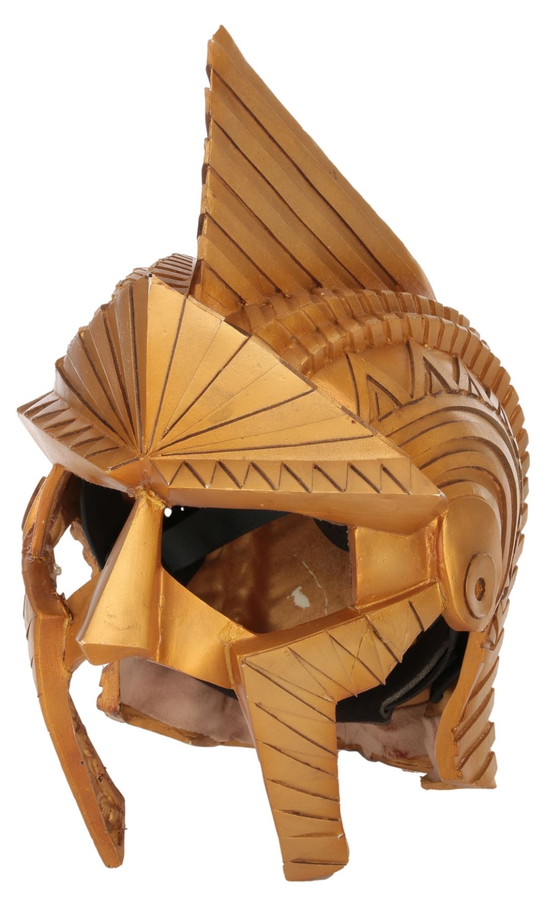 415. Eiko Ishioka-designed "Apollo" ensemble from The Immortals. (Relativity Media, 2011) Original (13) piece ensemble by Academy Award winning designer Eiko Ishioka consisting of a leather, fabric and cast poly resin and vacuum form plastic armor costume including (1) golden breastplate with sculpted musculature and scalloped waist with integral golden and burgundy satin cape attached to the shoulders and a lace-up closure on the side waist, handwritten on the interior chest, "Apollo stunt Chris McGuire", (1) loin cover with snap closure and red flap at the front waist embroidered with golden thread in a spiral design, retaining internal bias label handwritten, "Apollo", (1) golden loin cloth with elastic waistband and ribbon tie, (2) wide golden belts with velcro closures and midsections of spandex, retaining interior label handwritten, "Zeus", (1) fringed faux leather golden waistband, handwritten on the interior, "Theseus", (1) golden belt with a bas relief shell design, handwritten on the interior, "Apollo Stunt", (2) golden greaves with lace-up ties, each handwritten on the interior, "#19 Stunt C. McGuire", (2) golden bracers handwritten on the interior, "Apollo stunt", and (2) golden Roman-style lace-up sandals, handwritten on the interior, "Simon Northwood". This is an amalgam of costume pieces from various actors including Henry Cavill, Corey Sevier and stuntmen Simon Northwood and Christopher McGuire, it has been expertly assembled to complete an Apollo costume. Exhibiting some age and production wear, some cast pieces are minimally warped. In good to very good condition. $600 - $800