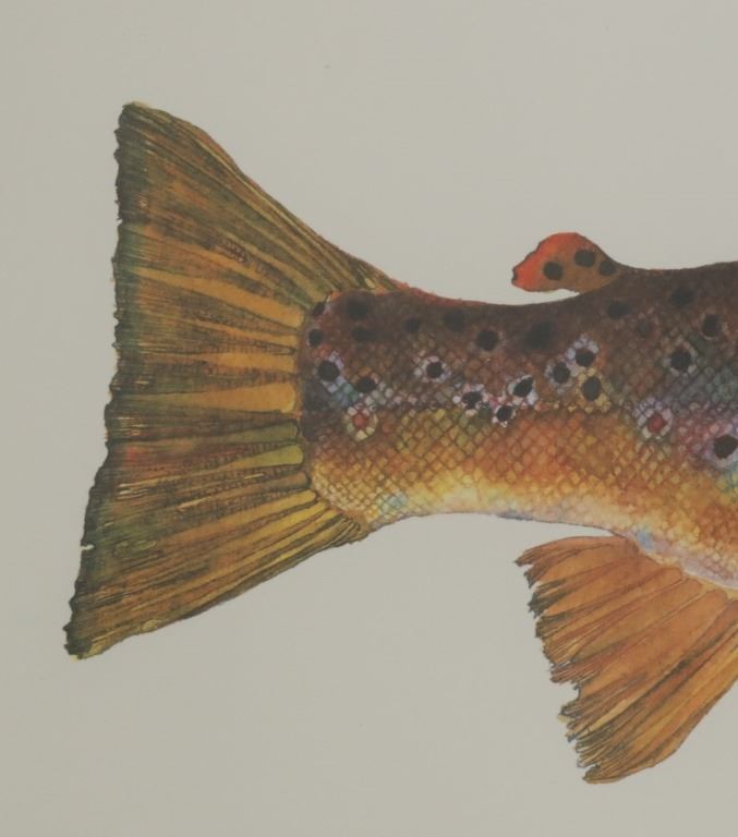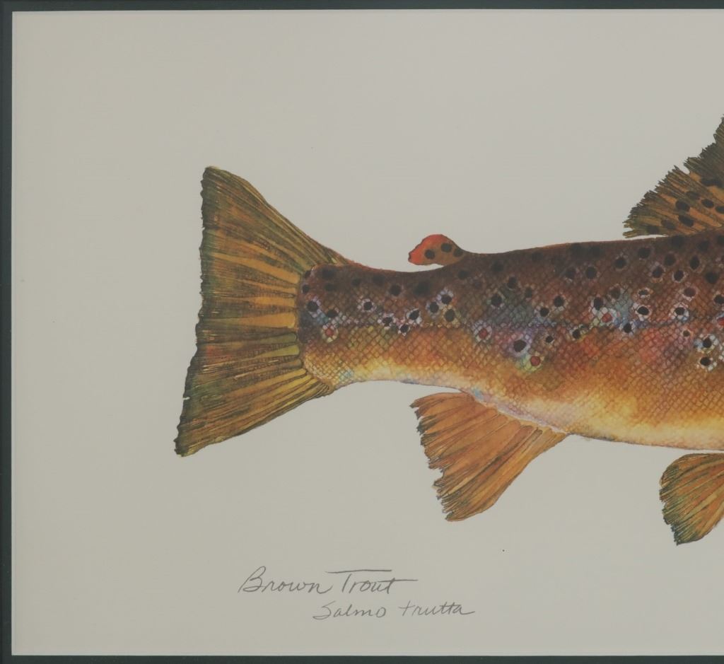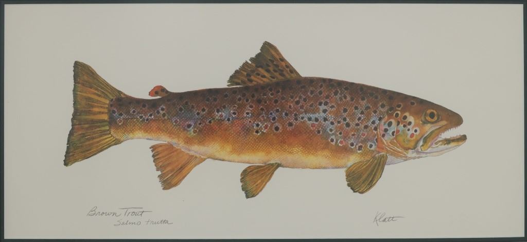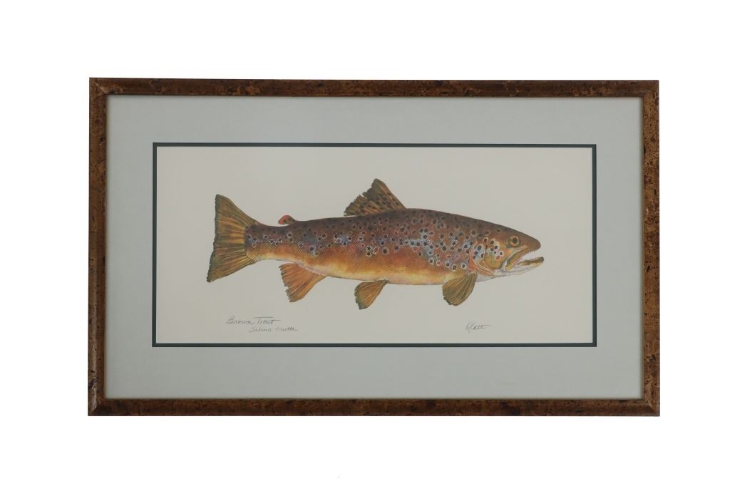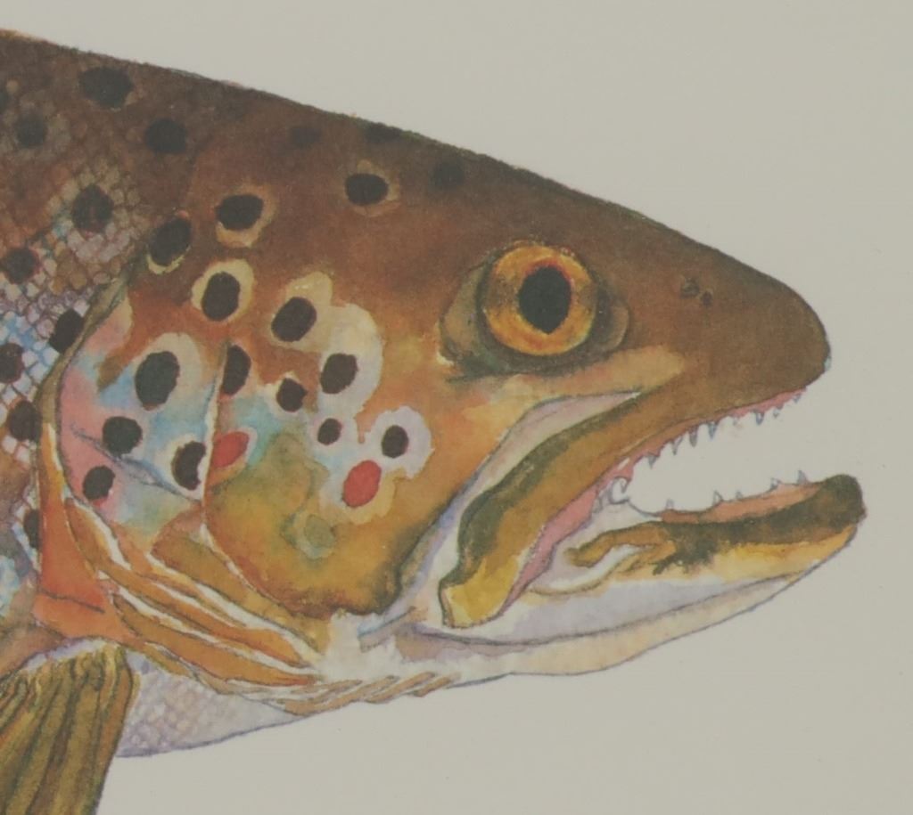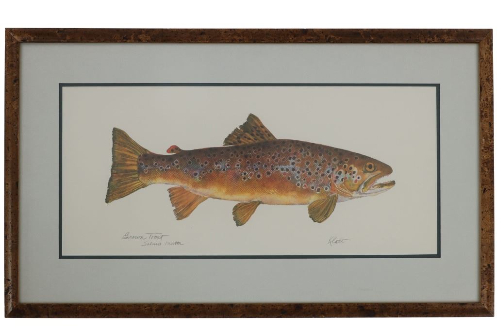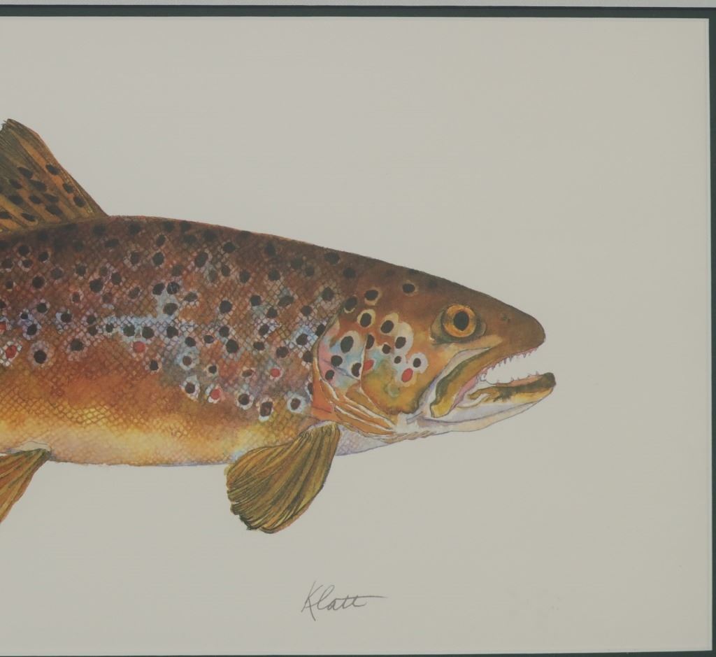 Featured in this lot is this framed watercolor of a Brown Trout / Salmo Trutta from Idaho artist Eileen Klatt. The framed artwork is wonderfully and professionally crafted watercolor construction. The watercolor of this Brown Trout shows good coloration that is natural to this species of trout with a dark brown on the top with slowly fading to lighter brown and later on the belly white, the Brown Trout shows specks throughout. The artwork is marked as follows: Brown Trout - Salmo Trutta - Klatt. The condition of this framed watercolor is good with no obvious signs of damage and shows good overall condition. The measurements of this framed watercolor is 15 1/2" x 26 1/4" and the visible artwork measures 9" x 20".