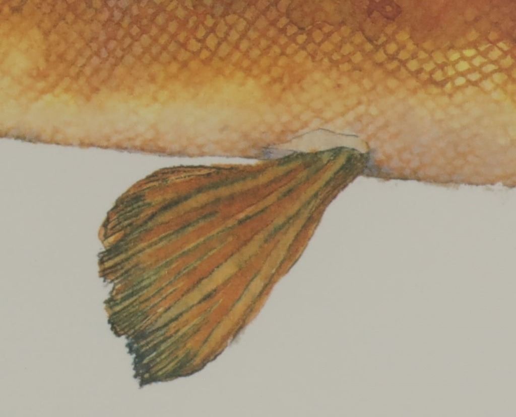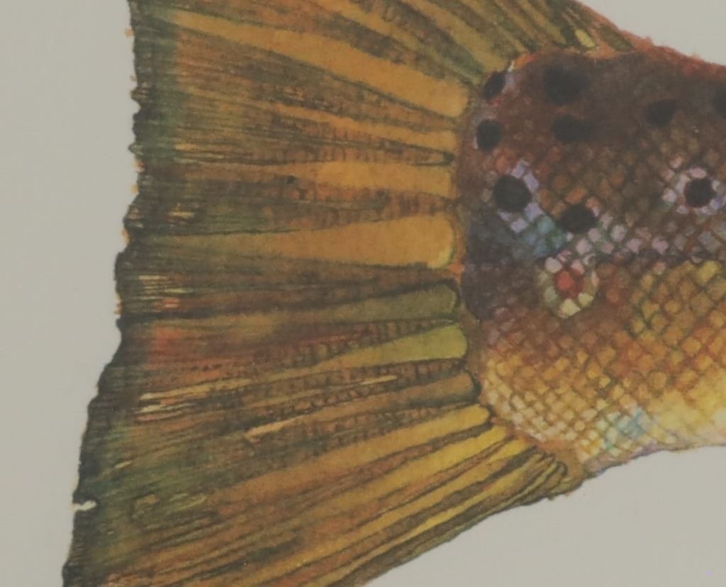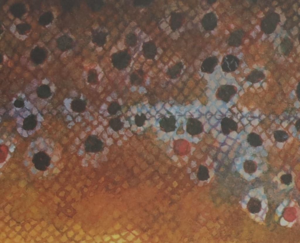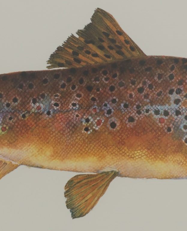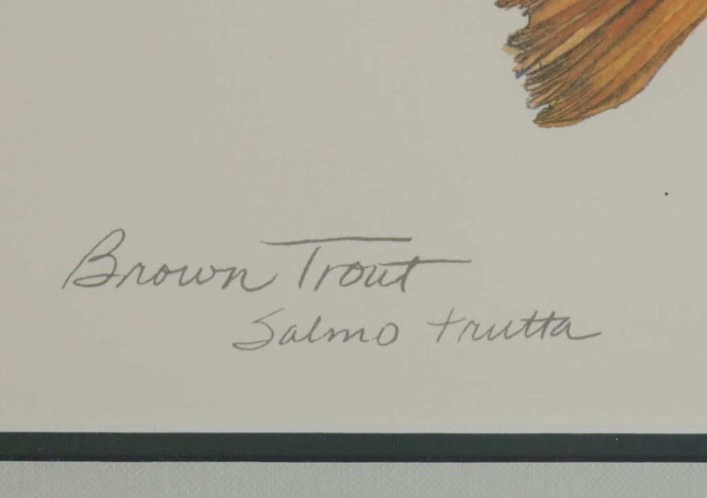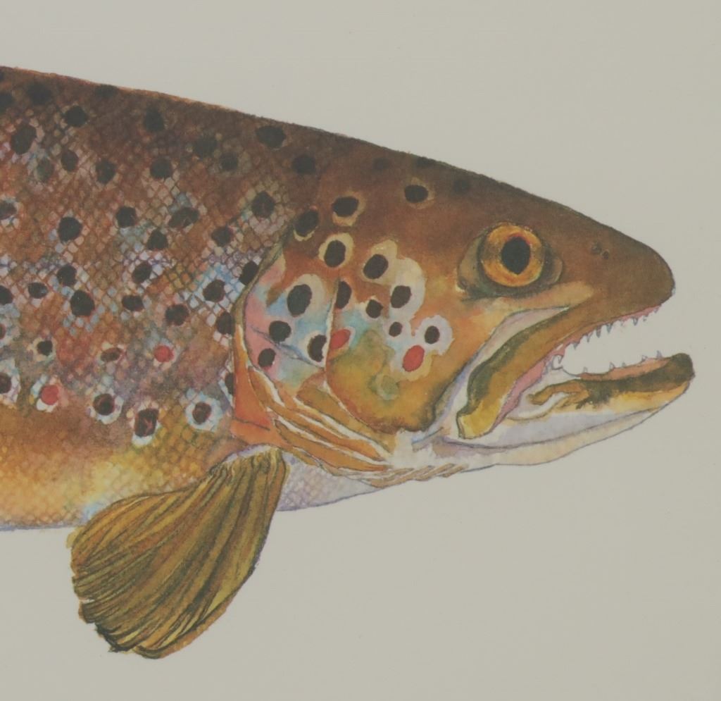 Featured in this lot is this framed watercolor of a Brown Trout / Salmo Trutta from Idaho artist Eileen Klatt. The framed artwork is wonderfully and professionally crafted watercolor construction. The watercolor of this Brown Trout shows good coloration that is natural to this species of trout with a dark brown on the top with slowly fading to lighter brown and later on the belly white, the Brown Trout shows specks throughout. The artwork is marked as follows: Brown Trout - Salmo Trutta - Klatt. The condition of this framed watercolor is good with no obvious signs of damage and shows good overall condition. The measurements of this framed watercolor is 15 1/2" x 26 1/4" and the visible artwork measures 9" x 20".