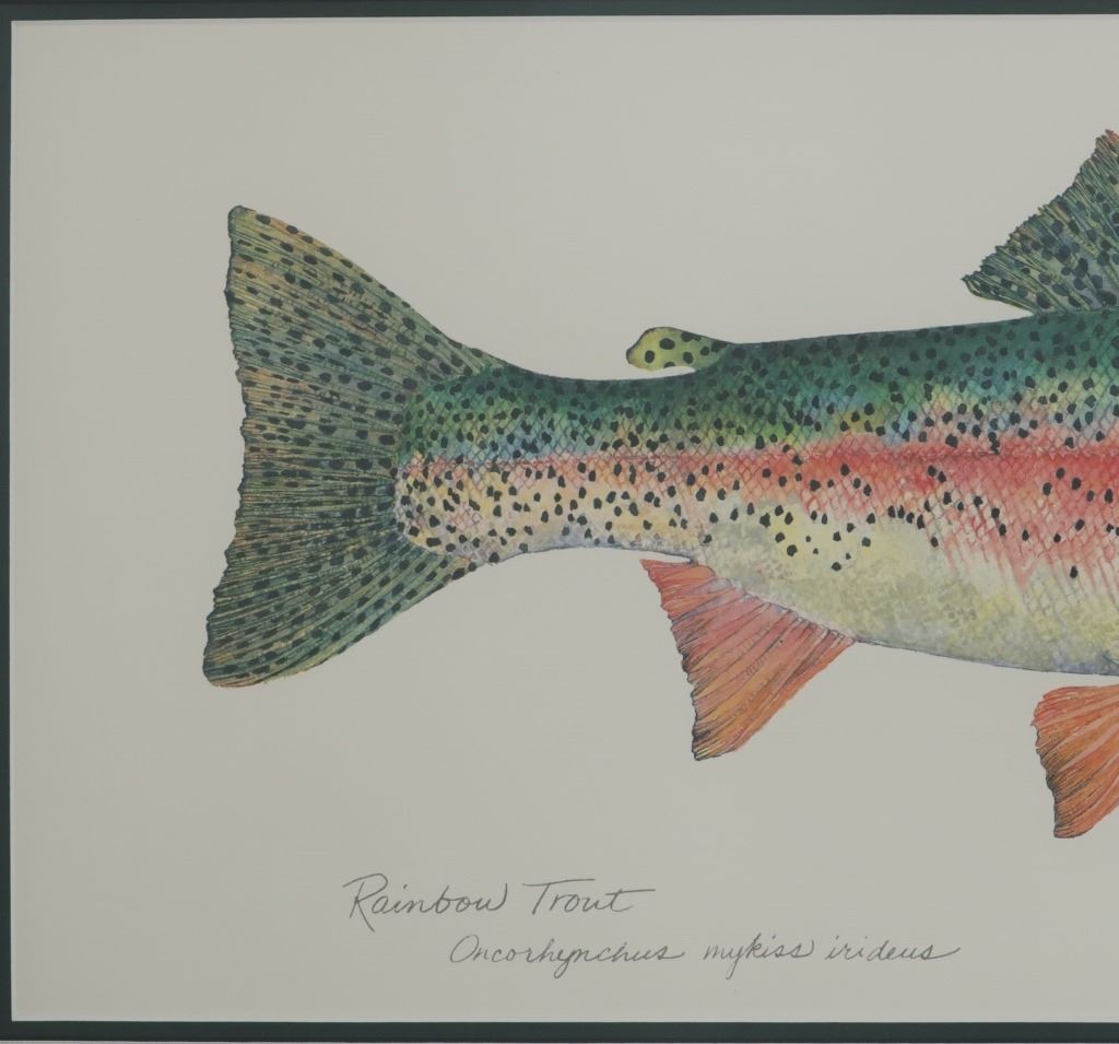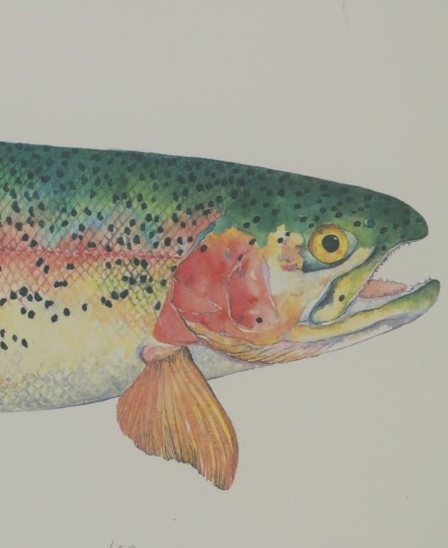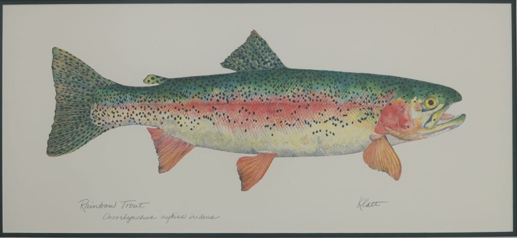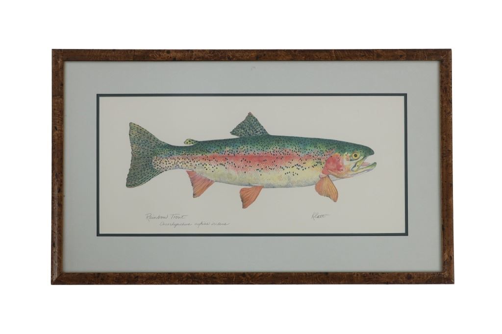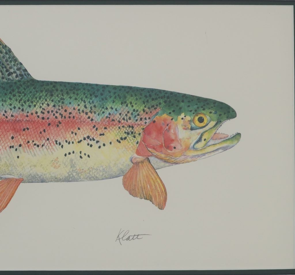 Featured in this lot is this framed watercolor of a Rainbow Trout by Idaho artist Eileen Klatt. The artwork features a wonderfully and professionally crafted watercolor construction. The artwork shows a figure of a Rainbow Trout that shows a green back with a salmon pink stripe fading to a white belly and shows speckles throughout the fish. The artwork is marked as follows: Rainbow Trout - Oncorhynchus mykiss Irieus. The condition of this framed watercolor painting is good with no obvious signs of damage and shows good overall condition. The measurements of this framed artwork is 15 1/2" x 26 1/4" and the visible artwork measures 9" x 20".