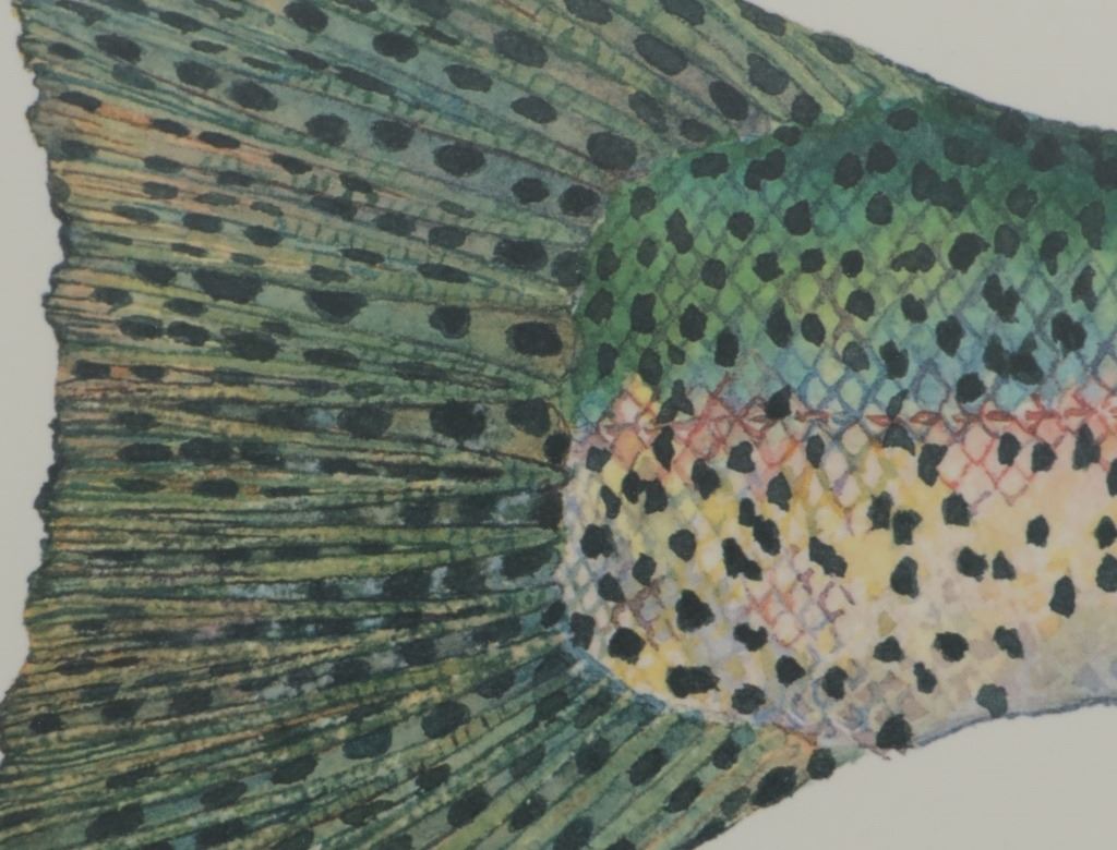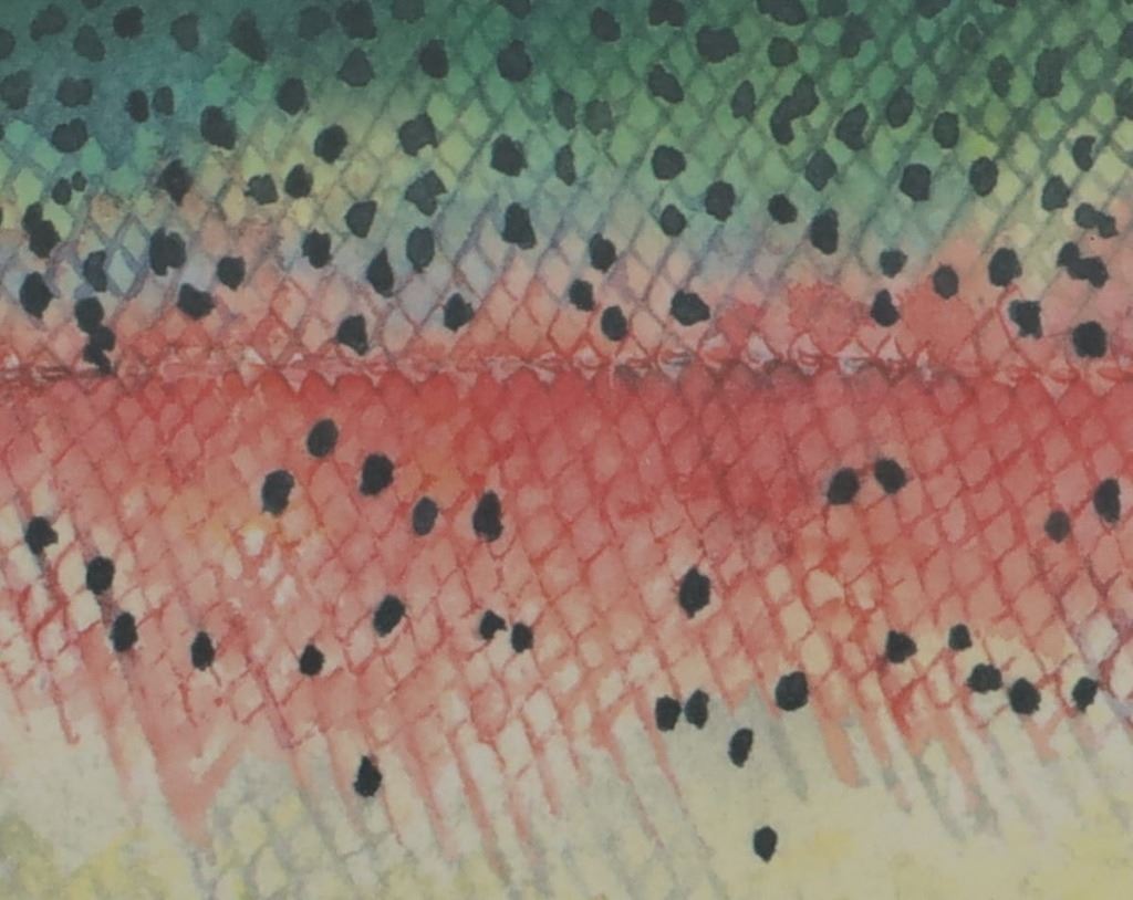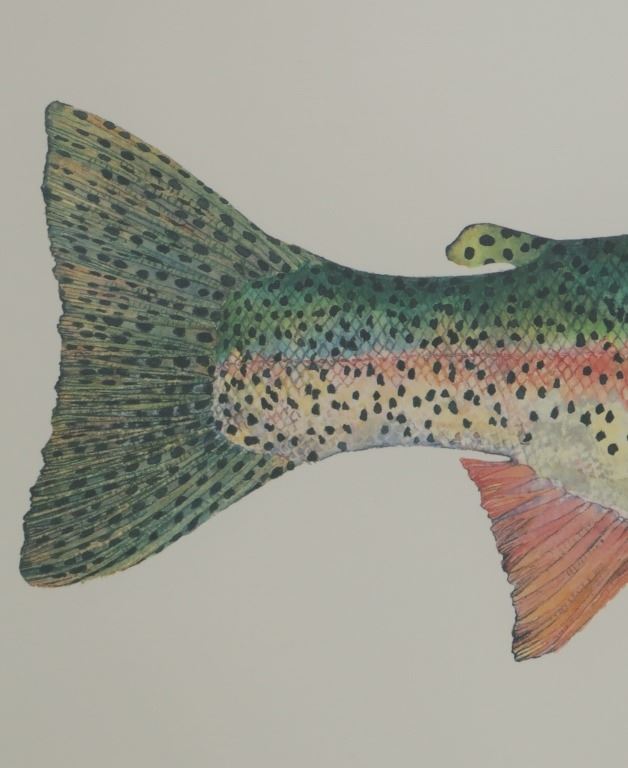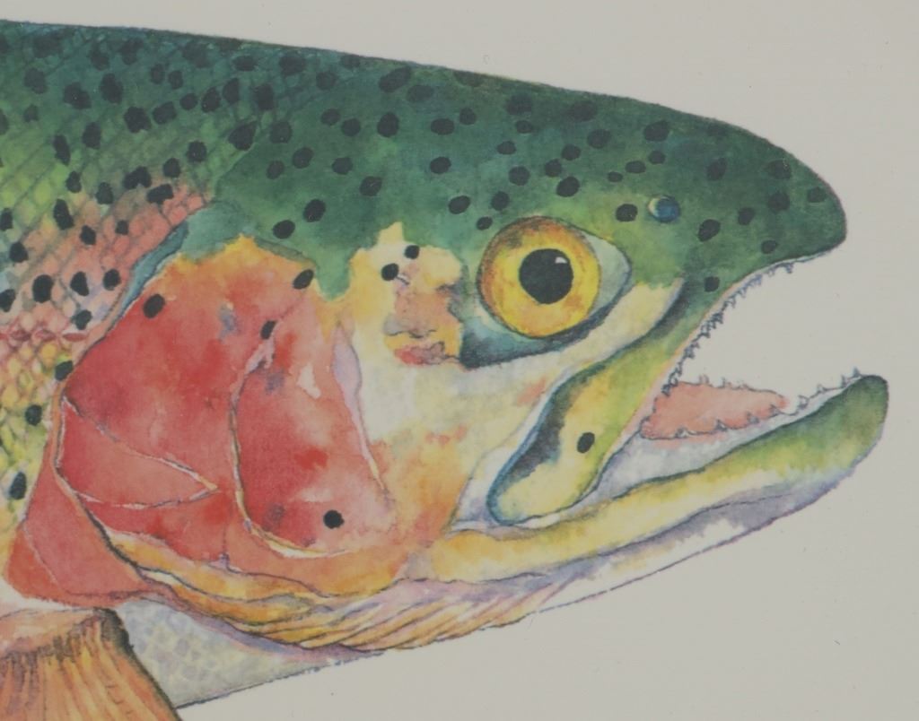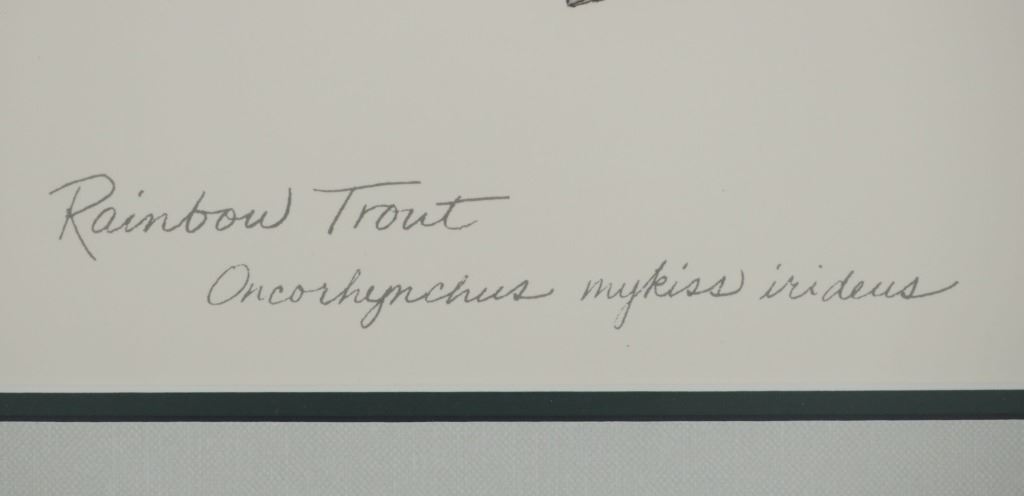 Featured in this lot is this framed watercolor of a Rainbow Trout by Idaho artist Eileen Klatt. The artwork features a wonderfully and professionally crafted watercolor construction. The artwork shows a figure of a Rainbow Trout that shows a green back with a salmon pink stripe fading to a white belly and shows speckles throughout the fish. The artwork is marked as follows: Rainbow Trout - Oncorhynchus mykiss Irieus. The condition of this framed watercolor painting is good with no obvious signs of damage and shows good overall condition. The measurements of this framed artwork is 15 1/2" x 26 1/4" and the visible artwork measures 9" x 20".