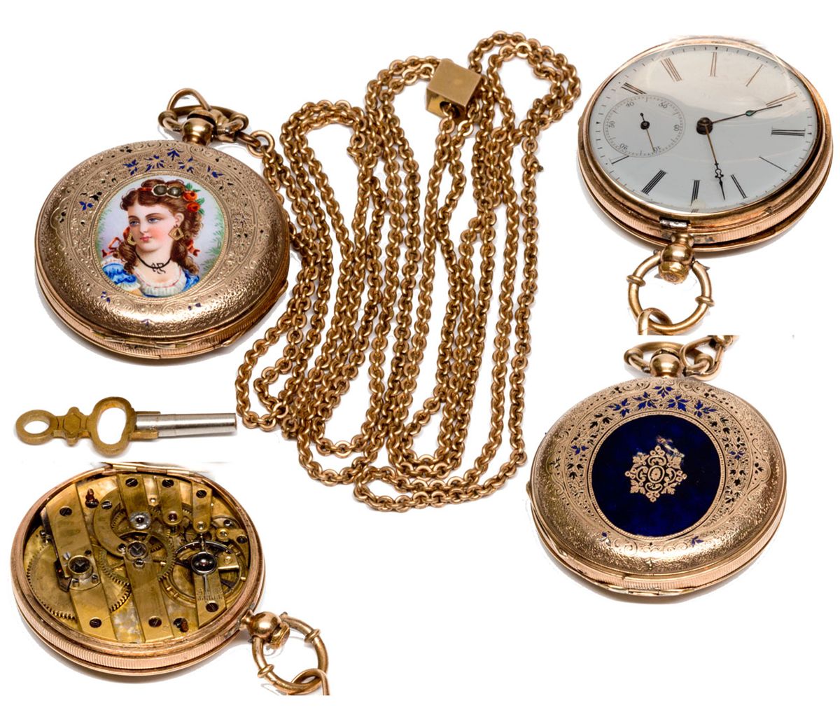 In 1946, her mansion was purchased by Washoe County and now serves as a county park and museum. Her ashes were lain to rest behind the mansion, alongside her husband and daughter’s remains. At some point during her desperate scramble to pay off her debts and stay afloat, Eilley pawned off much of her belongings, including the beautiful and ornate blue-enameled watch and opal chain slide featured in this lot.