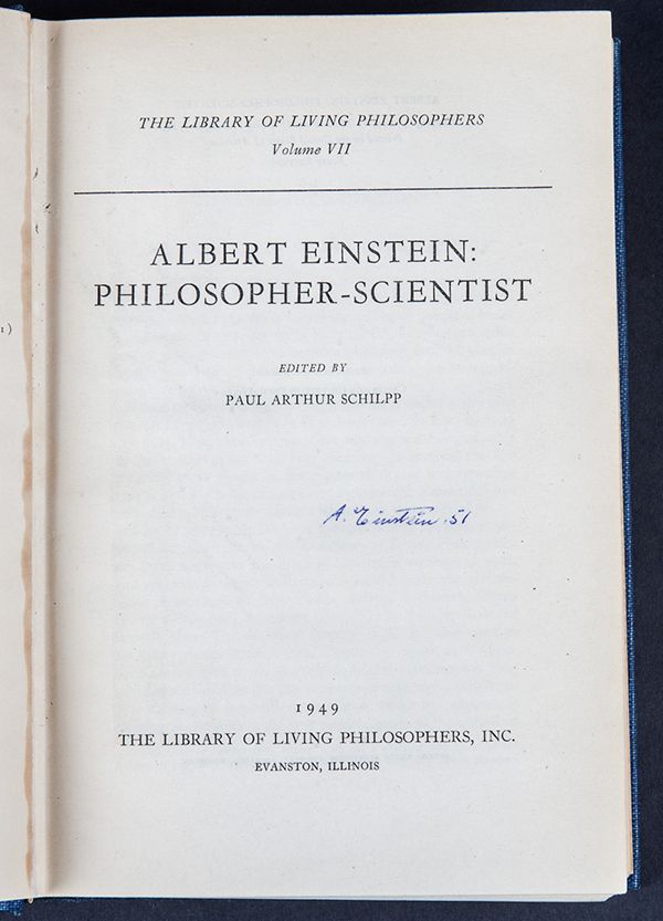 Einstein, Albert. 1st Edition of Albert Einstein: Philosopher-Scientist (The Library of Living Philosophers, Inc., Evanston, Illinois, 1949) signed on the title page ("A. Einstein, 51"). Some wear to blue cloth covers and pages are lightly toned throughout. Einstein turned 72 in 1951, the year he signed this book.