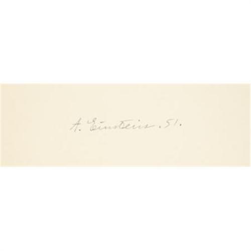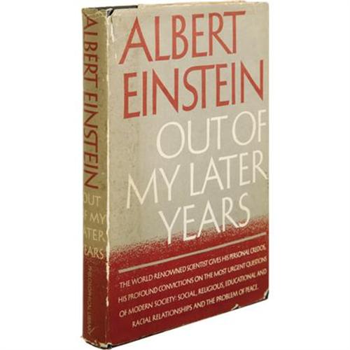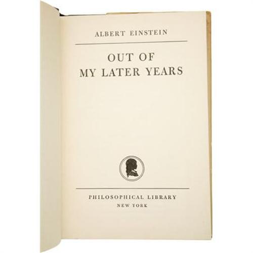 <B>Albert Einstein: Signed First Edition of <I>Out of My Later Years</B></I>.</B></I> (New York: Philosophical Library, 1950), first edition, later issue dust jacket with a picture of Einstein on the rear panel, 282 pages, dark blue cloth with gilt lettering on the spine and front board, 8vo (5.5" x 8.25"). Signed "<I>A. Einstein. 51.</B></I>" on the front free endpaper. This is a fascinating collection of Einstein's short essays on topics ranging from science to religion to issues of greater social concern with short pieces like "The Negro Question" and "Why Do They Hate the Jews?". Overall, the book is in very good condition, with minimal wear at the corners and spine. The dust jacket displays mild chipping along the bottom edge, a few very small scattered tears, as well as a 1" tear near the head of the spine. The textblock is tight and clean. Rare is the chance to obtain a signed Einstein book in any condition, and this book is one of the better volumes we've seen.<BR><BR><b>Shipping:</b> Books & Catalogs (<a target="_blank" href="http://www.heritageauctions.com/common/shipping.php">view shipping information</a>)