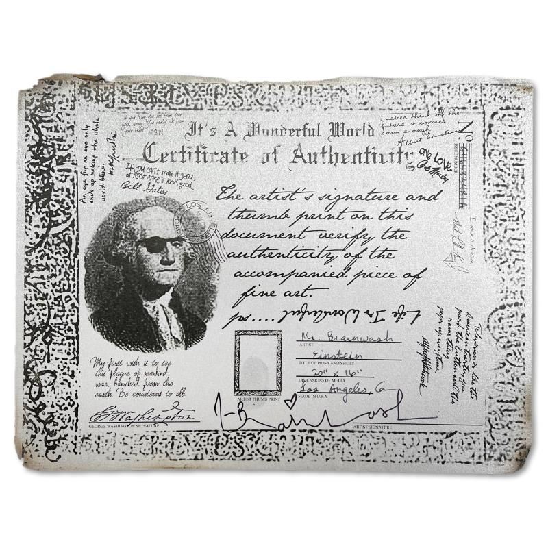 "Einstein" is a mixed media original on deckle edge paper by Mr. Brainwash, hand signed inverso and bearing the thumbprint of the artist. This piece comes custom framed. Includes Certificate of Authenticity. Measures approx. 24" x 20" (frame), 20" x 16" (image).