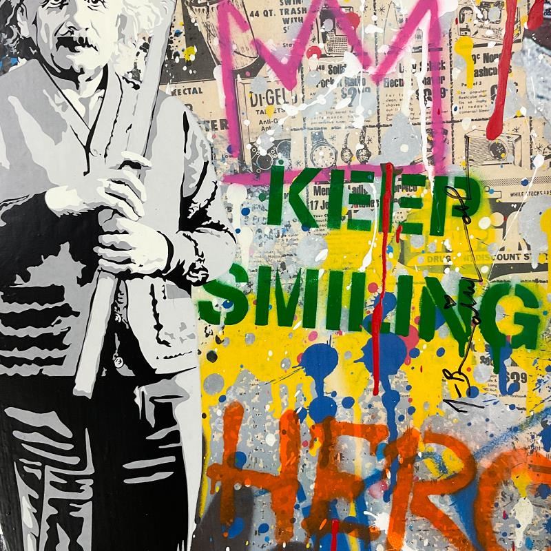 "Einstein" is a mixed media original on deckle edge paper by Mr. Brainwash, hand signed and bearing the thumbprint of the artist inverso. This piece comes custom framed. Includes Certificate of Authenticity. Measures approx. 34" x 26" (frame), 30" x 22" (image). This item requires special handling and may have a longer than usual turnaround.