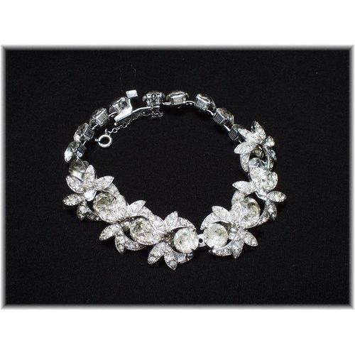 This stunning, vintage, signed Eisenberg bracelet is absolutely gorgeous and in wonderful vintage condition. Featuring a line of large, sparkling rhinestones, claw set in deep rhodium plated, open back settings. Mounted to each of the six central stones, are five marquise shaped rhodium petals, each encrusted with three sparkling, clear smaller stones. These are attached at an angle, giving each one depth and movement and so much sparkle. This bracelet measures 7 inches, with a safety chain and a rhinestone atop the safety clasp. There is minimal aging to a few stones, barely visible to the naked eye. This bracelet exudes glamour and style, a trademark of the Eisenberg design.
