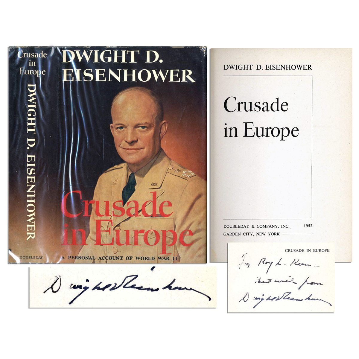 Rare signed copy of President Dwight D. Eisenhower's WWII memoir ''Crusade in Europe,'' published by Doubleday and Company, Inc.: Garden City: 1952. Eisenhower inscribes ''To Roy L. Kern - Best wishes from Dwight Eisenhower'' on the half-title page. Bound in tan cloth boards with maps on endpapers. Book measures 6'' x 8.5'' and runs 559pp. Book is in near fine condition. Original dustjacket present, though in poor condition, covered with a very good later edition dustjacket.
