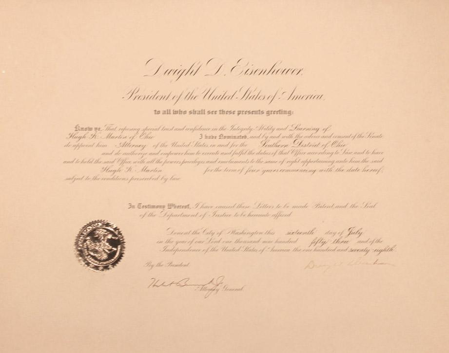 President Dwight D. Eisenhower document signed as President, dated 17 July 1953. Document appoints Hugh K. Martin as Attorney for the Southern District of Ohio and bears a gold United States of America seal at lower left. Bottom has the signatures of Eisenhower and Attorney General Herbert Brownell in brown ink. 19.5'' x 15'' document lightly toned and mounted to paperboard. Overall in very good condition.