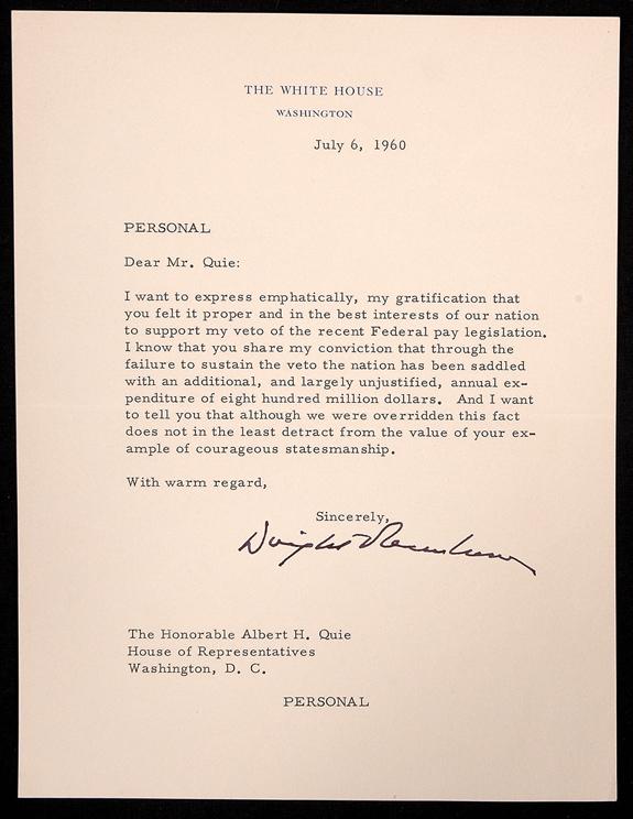 Eisenhower, Dwight D. Typed letter signed as President, 1 page, on The White House letterhead, 8¾ x 6¾", Washington, July 6, 1960. Marked "Personal," to Albert H. Quie, U.S. Representative from Minnesota (1958-1979), thanking him for supporting Eisenhower's "veto of the recent Federal pay legislation. I know that you share my conviction that through the failure to sustain the veto the nation has been saddled with an additional, and largely unjustified, annual explenditure of eight hundred million dollars….although we were overridden this fact does not in the least detract from the value of your example of courageous statesmanship…." Very fine. Accompanied by an engraving. On June 30, 1960, Eisenhower had vetoed a bill to increase the salaries of Federal employees. The Congress passed the bill over his veto.