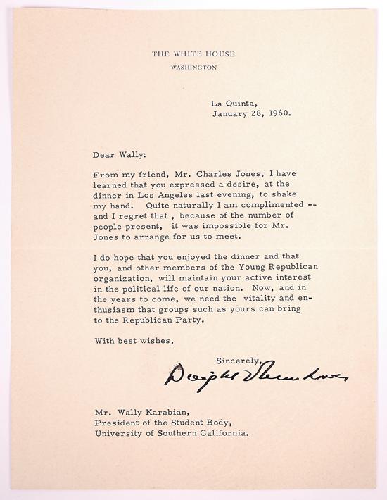 Eisenhower, Dwight D. Typed Letter Signed as President on The White House letterhead, 1 page, La Quinta (Resort and Club in Palm Springs, California), January 28, 1960. To Wally Karabian, President of the Student Body at the University of Southern California, stating that Charles Jones (an oil tycoon and one of Ike's bridge-playing friends) had told him that Wally had wanted to shake his hand at the dinner in Los Angeles and that he regretted that the number of people present had prevented it. He adds, "I do hope that you…and other members of the Young Republican organization, will maintain your active interest in the political life of our nation….we need the vitality and enthusiasm that groups such as yours can bring to the Republican Party." With White House transmittal envelope. Fine.
