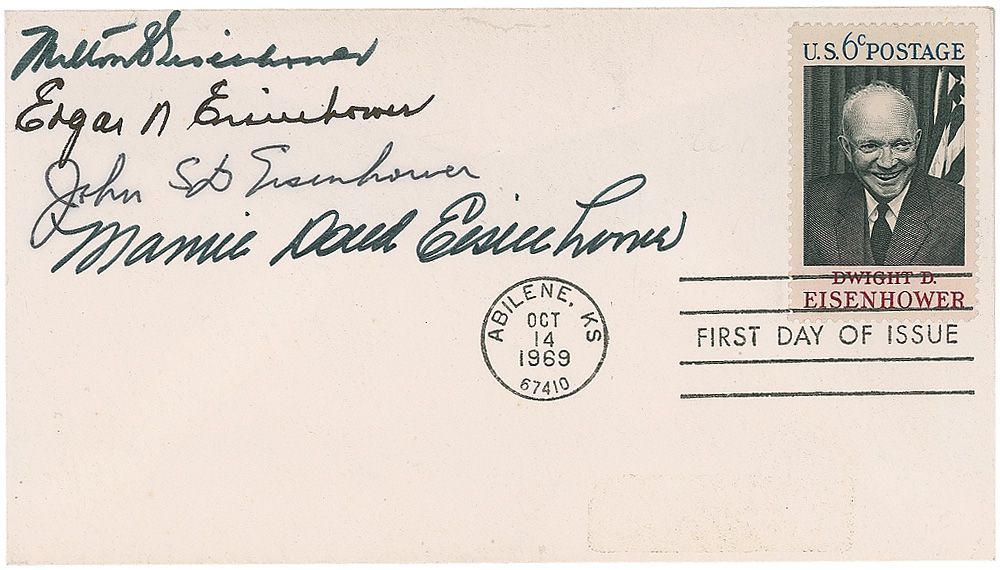 FDC, postmarked October 14, 1969, and bearing a six-cent Dwight D. Eisenhower postage stamp, signed in black felt tip by four members of the Eisenhower family, including Milton, Edgar, John, and Mamie. In fine condition.
