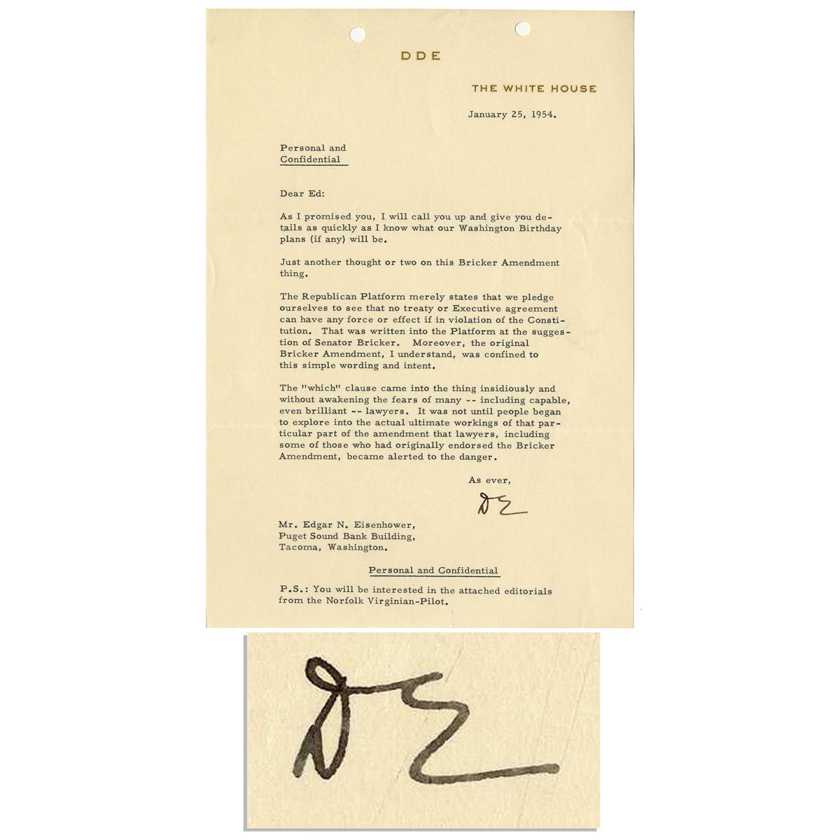 Dwight D. Eisenhower typed letter signed as President, dated 25 January 1954 on official White House stationery. Here, Eisenhower writes to his brother, Edgar, discussing the controversial Bricker Amendment: ''Dear Ed: As I promised you, I will call you up and give you details as quickly as I know what our Washington Birthday plans (if any) will be. Just another thought or two on this Bricker Amendment thing. The Republican Platform merely states that we pledge ourselves to see that no treaty or Executive agreement can have any force or effect if in violation of the Constitution. That was written into the Platform at the suggestion of Senator Bricker. Moreover, the original Bricker Amendment, I understand, was confined to this simple wording and intent. The 'which' clause came into the thing insidiously and without awakening the fears of many -- including capable, even brilliant -- lawyers. It was not until people began to explores into the actual ultimate workings of that particular part of the amendment that lawyers, including some of those who had originally endorsed the Bricker Amendment, became alerted to the danger...P.S.: You will be interested in the attached editorials from the Norfolk Virginian-Pilot.'' Signed ''DE'' in black ink, letter measures 7'' x 10.5'' with two holes punched at top. Minor toning, else near fine.