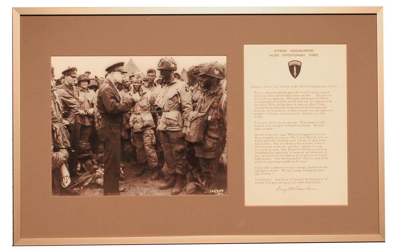 Autographed copy of General Dwight Eisenhower’s stirring D-Day speech. 5.75'' x 9'' document is framed with a photo of Eisenhower speaking to GI's, for an overall size of 20.75'' x 13''. Clearly signed “Dwight Eisenhower” at the bottom in blue fountain pen. Light creasing and very light scuff to lower left edge, else fine.