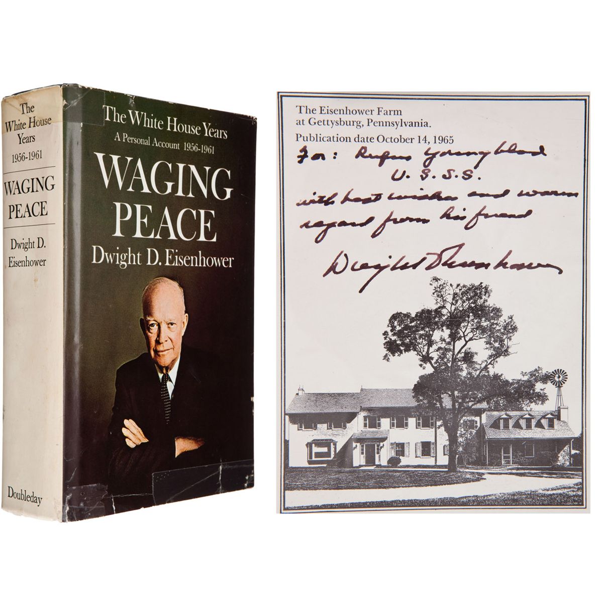 Dwight D. Eisenhower-signed memoir on his second term in the White House, ''Waging Peace,'' published by Doubleday and Company: Garden City: 1965. The President inscribes a bookplate on the half-title page ''For: Rufus Youngblood U.S.S.S. with best wishes and warm regard from his friend'' and signs boldly ''Dwight D. Eisenhower''. Book measures 5.75'' x 8.5'' and runs 741pp., including 38pp. of photographs and maps. Tape repair to dustjacket and tears along edges. Overall excellent.