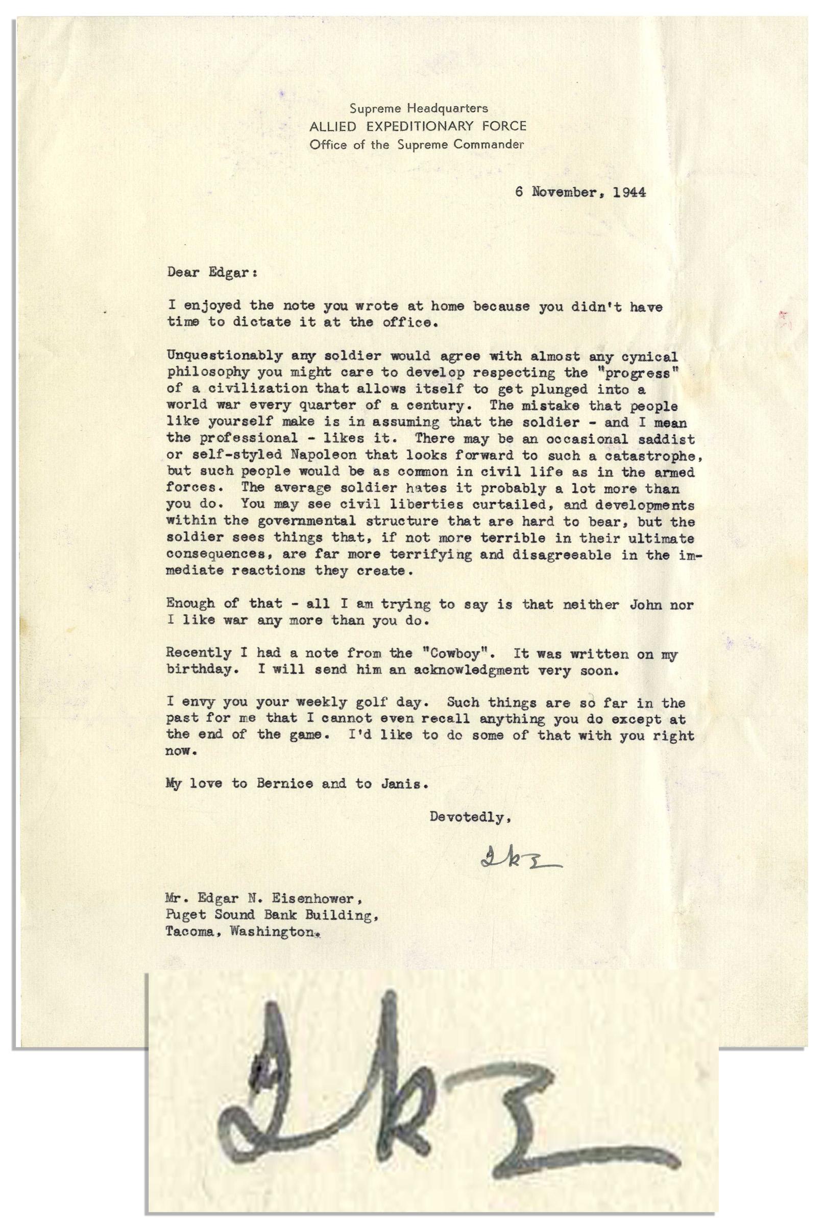Dwight D. Eisenhower typed letter signed, dated 6 November 1944 on ''Allied Expeditionary Force / Office of the Supreme Commander'' stationery. Letter is addressed to Eisenhower's brother, Edgar, and reads in full: ''Dear Edgar: I enjoyed the note you wrote at home because you didn't have time to dictate it at the office. Unquestionably any soldier would agree with almost any cynical philosophy you might care to develop respecting the 'progress' of a civilization that allows itself to get plunged into a world war every quarter of a century. The mistake that people like yourself make is in assuming that the soldier -- and I mean the professional -- likes it. There may be an occasional saddist or self-styled Napoleon that looks forward to such a catastrophe, but such people would be as common in civil life as in the armed forces. The average soldier hates it probably a lot more than you do. You may see civil liberties curtailed, and developments with the governmental structure that are hard to bear, but the soldier sees things that, if not more terrible in their ultimate consequences, are far more terrifying and disagreeable in the immediate reactions they create. Enough of that -- all I am trying to say is that neither John nor I like war any more than you do. Recently I had a note from the 'Cowboy.' It was written on my birthday. I will send him an acknowledgment very soon. I envy your weekly golf day. Such things are so far in the past for me that I cannot even recall anything you do except at the end of the game…'' Signed ''Ike''. Letter measures 8'' x 10.5'' on one page. Minor creasing in spots else near fine.