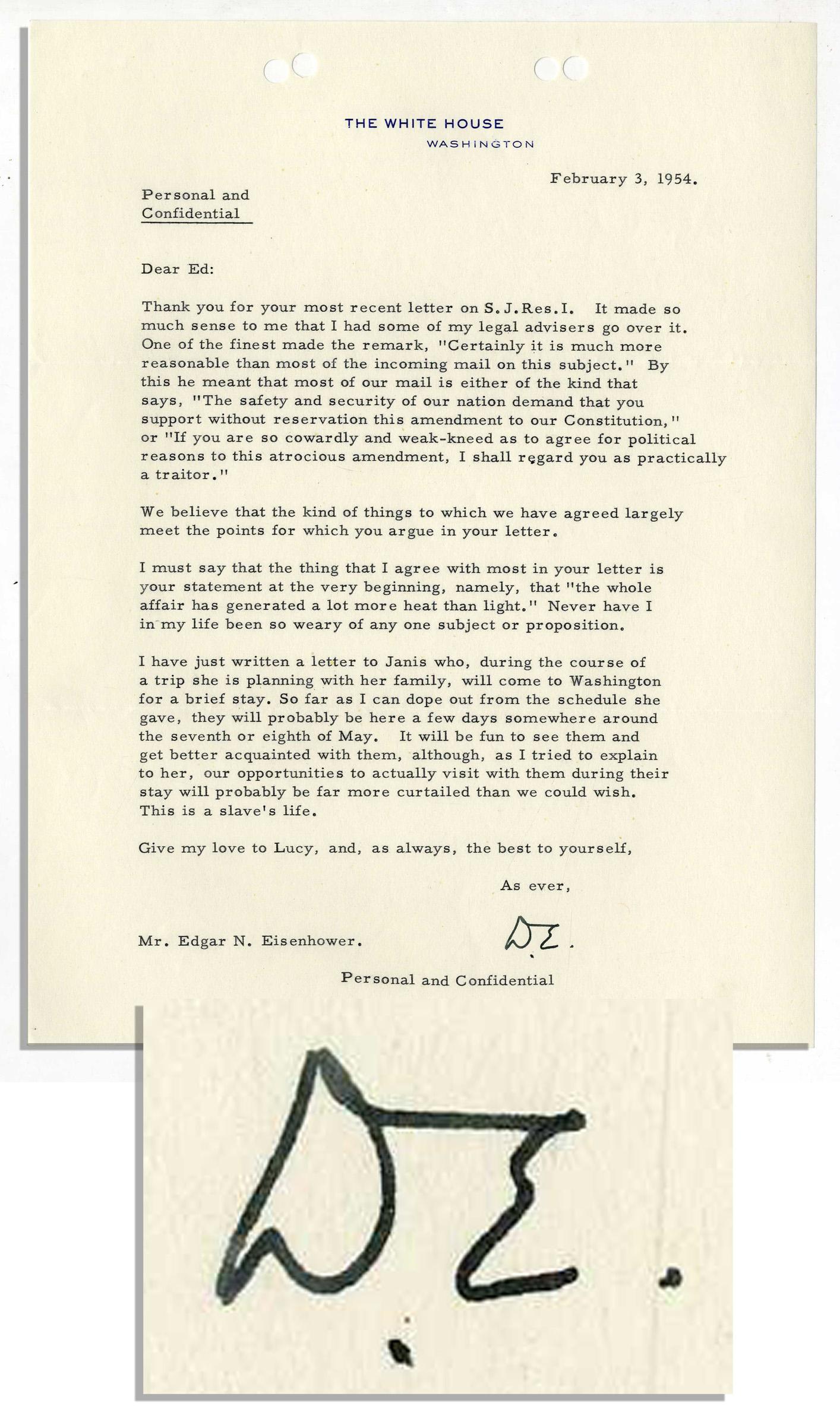 Dwight D. Eisenhower typed letter signed as President, dated 3 February 1954 on official ''Personal and Confidential'' White House stationery. Here, Eisenhower writes to his brother Edgar, discussing their agreements and disagreements relating, presumably, to the Bricker Amendment: ''Thank you for your most recent letter on S.J.Res.I. [Senate Joint Resolution I] It made so much sense to me that I had some of my legal advisers go over it. One of the finest made the remark, 'Certainly it is much more reasonable than most of the incoming mail on this subject.' By this he meant that most of our mail is either of the kind that says, 'The safety and security of our nation demand that you support without reservation this amendment to our Constitution,' or 'If you are so cowardly and weak-kneed as to agree for political reasons to this atrocious amendment, I shall regard you as practically a traitor.' We believe that the kind of things to which we have agreed largely meet the points for which you argue in your letter. I must say that the thing that I agree with most in your letter is your statement at the very beginning, namely, that 'the whole affair has generated a lot more heat than light.' Never have I in my life been so weary of any one subject or proposition. I have just written a letter to Janis who, during the course of a trip she is planning with her family, will come to Washington for a brief stay. So far as I can dope out from the schedule she gave, they will probably be here a few days somewhere around the seventh or eighth of May…This is a slaves life.'' Signed clearly, ''D.E.'' Letter measures 8'' x 10.5'' on one page, with four holes punched at top. Near fine.