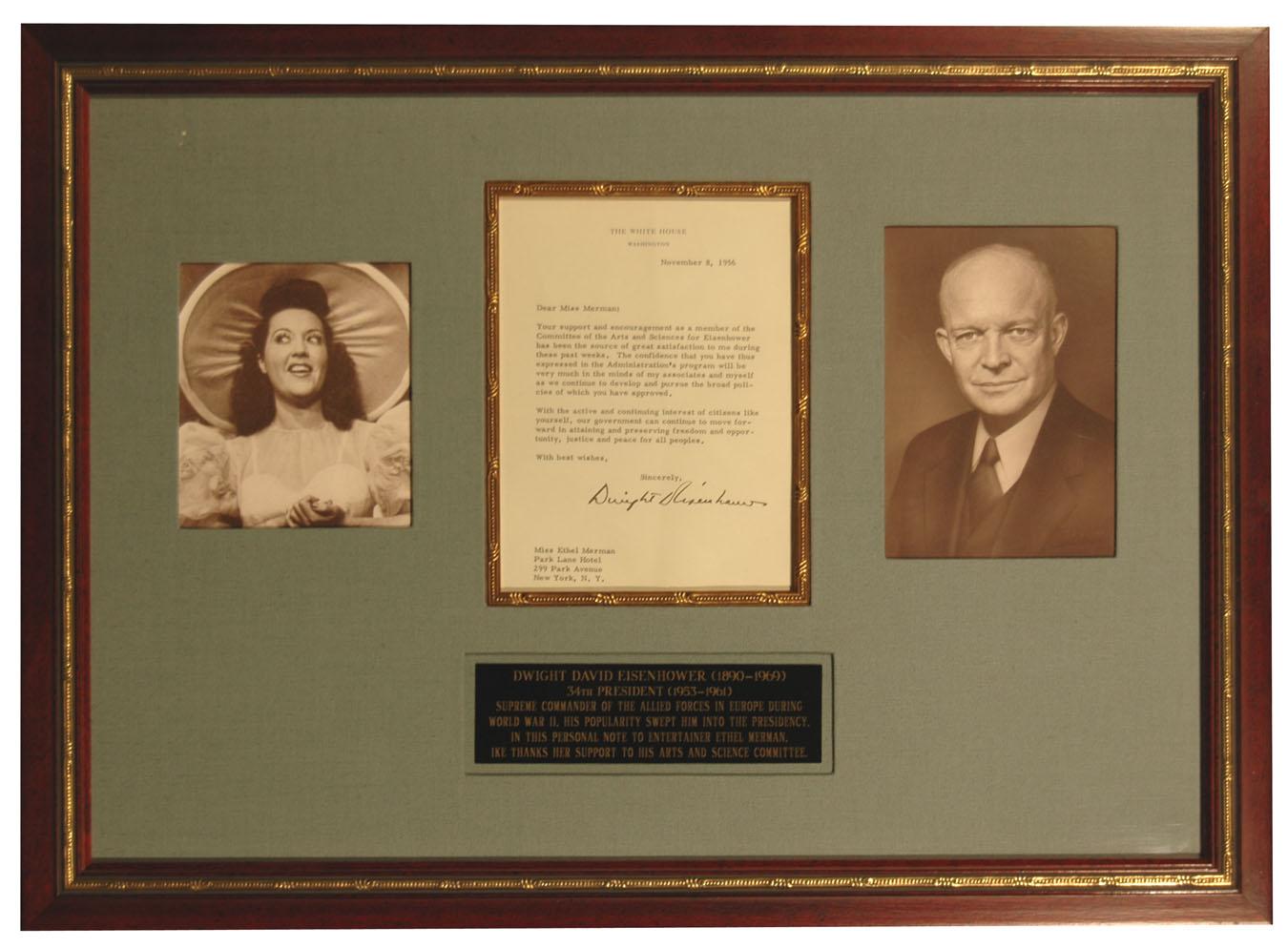 President Dwight D. Eisenhower typed letter signed to Ethel Merman. Composed on ''The White House / Washington'' stationery & dated 8 November 1956, letter reads in part: ''...the Committee of the Arts and Sciences for Eisenhower has been the source of great satisfaction to me...and...will be very much in the minds of my associates and myself as we continue to develop and pursue the broad policies of which you have approved...'' Handsomely framed and matted with photographs of both Merman & Eisenhower to 25.25'' x 18.25''. Fine condition.