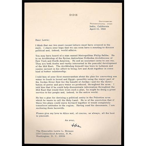 <Our item number 141108><B>Eisenhower, Dwight D.</B> Typed letter signed ("Ike") on "DDE" letterhead, 1p, 10¼x7 in., Indio, California, 13 April 1968. To Lewis Strauss (1896-1974), who served as chairman of the U.S. Atomic Energy Commission between 1953 and 1958, regarding Metropolitan Philip Saliba, Archbishop of the Syrian Antiochian Orthodox Archdiocese of New York and North America. Saliba has told Eisenhower of his "plan for devising a political entity in the Palestine area which he wants to call the Holy Land…." and which Saliba would like to combine with a plan Strauss has "for converting sea water to fresh in Israel and Egypt--possibly using the major part of the Jordan River flow for the benefit of Jordan---and for the distribution of power and pure water…throughout the area…." Very fine. <BR>Estimated Value $1,500 - 2,000. <BR><BR>Our item number 141108<BR><IMAGES><P ALIGN="CENTER"><IMG SRC="http://www.goldbergcoins.net/liveauction/49jpegs/1 41108.jpg"> </P></IMAGES>