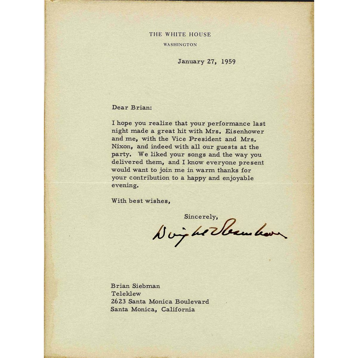 Dwight Eisenhower Typed Letter Signed as President -- ''...your performance made a great hit...'' -- 6.75'' x 9'' Letter Mounted, Else Very Good