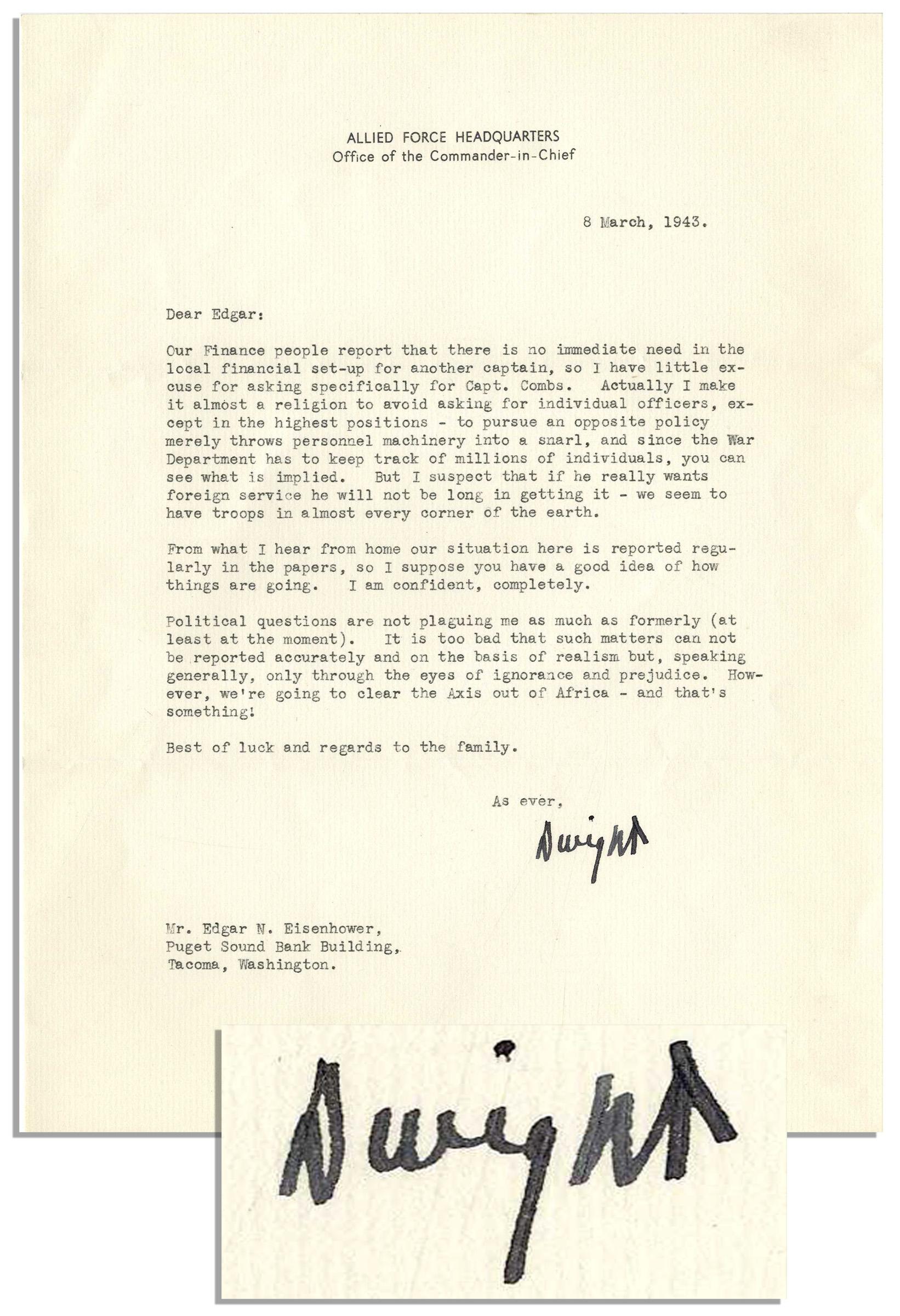 Dwight D. Eisenhower typed letter signed, dated 8 March 1943 on ''Allied Force Headquarters'' stationery. Here, Eisenhower writes to his brother Edgar discussing the removal of the Axis in Africa, among other WWII topics: ''…Our finance people report that there is no immediate need in the local financial set-up for another captain, so I have little excuse for asking specifically for Capt. Combs. Actually I make it almost a religion to avoid asking for individual officers, except in the highest positions -- to pursue an opposite policy merely throws personnel machinery into a snarl, and since the War Department has to keep track of millions of individuals, you can see what is implied. But I suspect that if he really wants foreign service he will not be long in getting it -- we seem to have troops in almost every corner of the earth. From what I hear from home our situation here is reported regularly in the papers, so I suppose you have a good idea of how things are going. I am confident, completely. Political questions are not plaguing me as much as formerly (at least at the moment). It is too bad that such matters can not be reported accurately and on the basis of realism but, speaking generally, only through the eyes of ignorance and prejudice. However, we're going to clear the Axis out of Africa -- and that's something!'' Signed simply ''Dwight'' in black ink. Letter measures 8'' x 10.25'' on one page. Near fine.