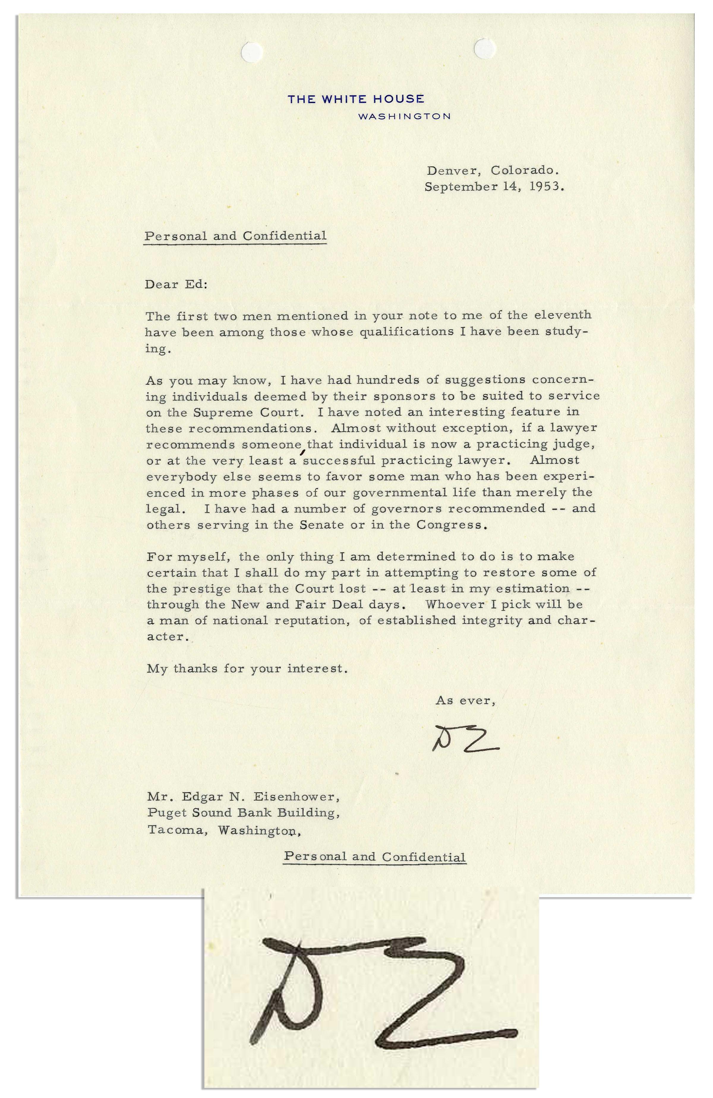 Dwight D. Eisenhower typed letter signed as President, dated 14 September 1953 on White House stationery from Denver. Eisenhower writes to his brother Edgar, discussing who he would nominate to the Supreme Court to replace Chief Justice Fred Vinson. Ironically, Eisenhower tapped Earl Warren who helmed the Court during one of its most activist periods, leading Eisenhower to later lament that Warren's nomination was ''the biggest damned-fool mistake I ever made.'' Many believe that Warren's support of Eisenhower as President was a quid pro quo exchange for a high court nomination. In part: ''Dear Ed: The first two men mentioned in your note to me of the eleventh have been among those whose qualifications I have been studying...I have noticed an interesting feature in these recommendations. Almost without exception, if a lawyer recommends someone, that individual is now a practicing judge, or at the very least a successful practicing lawyer. Almost everybody else seems to favor some man who has been experienced in more phases of our governmental life than merely the legal. I have had a number of governors recommended -- and others serving in the Senate or in Congress. For myself, the only thing I am determined to do is to make certain that I shall do my part in attempting to restore some of the prestige that the Court lost -- at least in my estimation -- through the New Deal and Fair Deal days. Whoever I pick will be a man of reputation, of established integrity and character…'' Signed ''DE'' in black ink. Letter measures 8'' x 10.5'' on one page with two holes punched at top. Near fine.