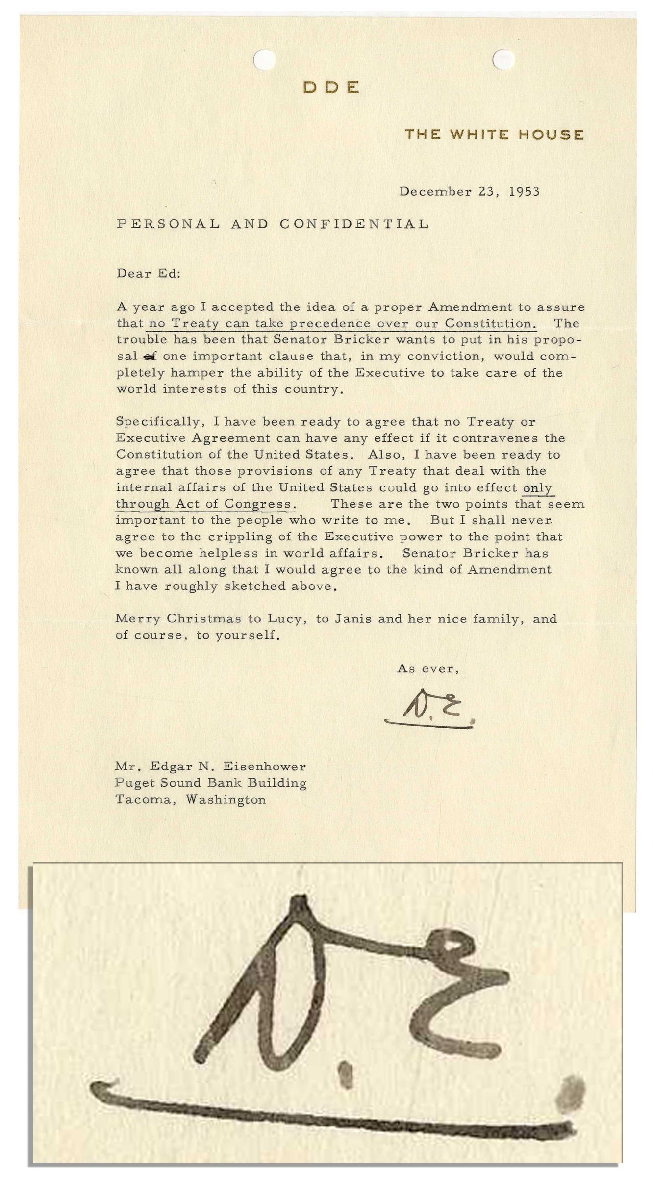 Dwight D. Eisenhower typed letter signed as President, dated 23 December 1953 on official ''Personal and Confidential'' White House stationery. Here, Eisenhower writes to his brother Edgar discussing the Bricker Amendment: ''…A year ago I accepted the idea of a proper Amendment to assure that no Treaty can take precedence over our Constitution. The trouble has been that Senator Bricker wants to put in his proposal one important clause that, in my conviction, would completely hamper the ability of the Executive to take care of the world interests of this country. Specifically, I have been ready to agree that no Treaty or Executive Agreement can have any effect if it contravenes the Constitution of the United States. Also, I have been ready to agree that those provisions of any Treaty that deal with the internal affairs of the United States could go into effect only through Act of Congress. These are the two points that seem important to the people who write to me. But I shall never agree to the crippling of the Executive power to the point that we become helpless in world affairs. Senator Bricker has known all along that I would agree to the kind of Amendment I have roughly sketched above…'' Signed ''D.E.'' in black ink. Letter measures 7'' x 10.25'' on one page, with two holes punched at top. Near fine condition.