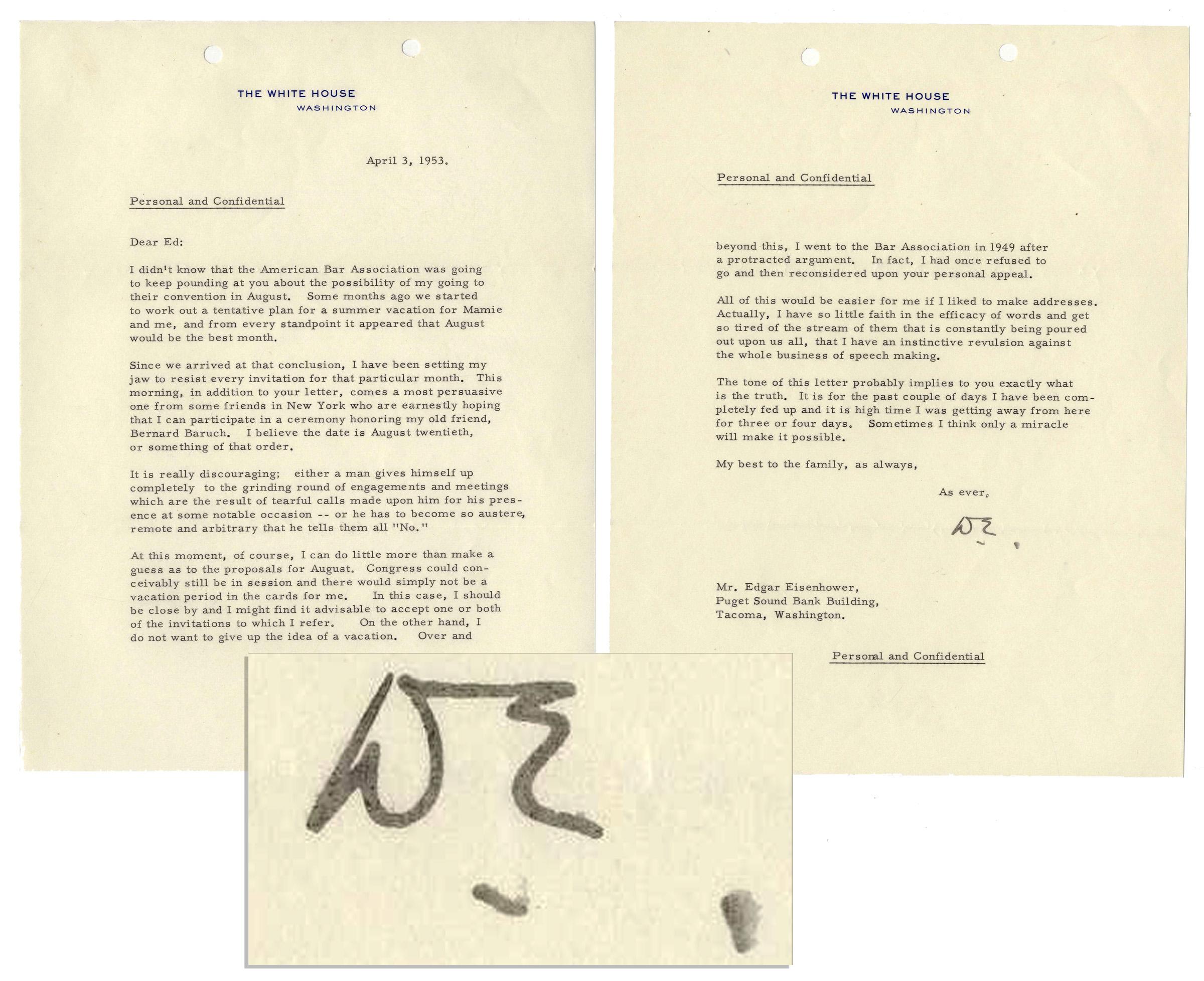 Dwight D. Eisenhower typed letter signed as President, dated 3 April 1953 on official White House ''Personal and Confidential'' stationery. Here, Eisenhower writes to his brother Edgar and discusses his complaints about the time commitment in a political office: ''…It is really discouraging; either a man gives himself up completely to the grinding round of engagements and meetings which are the result of tearful calls made upon him for his presence at some notable occasion -- or he has to become so austere, remote and arbitrary that he tells them all 'No.'…Congress could conceivably still be in session and there would simply not be a vacation period in the cards for me. In this case, I should be close by and I might find it advisable to accept one or both of the invitations to which I refer. On the other hand, I do not want to give up the idea of a vacation. Over and beyond this, I went to the Bar Association in 1949 after a protracted argument. In fact, I had once refused to go and then reconsidered upon your personal appeal. All of this would be easier for me if I liked to make addresses. Actually, I have so little faith in the efficacy of words and get so tired of the stream of them that is constantly being poured out upon us all, that I have an instinctive revulsion against the whole business of speech making. The tone of this letter probably implies to you exactly what is the truth. It is for the past couple of days I have been completely fed up and it is high time I was getting away from here for three or four days. Sometimes I think only a miracle will make it possible.'' Signed ''D.E.'' in black ink. Letter measures 8'' x 10.5'' on two pages, with two holes punched at top. Near fine.