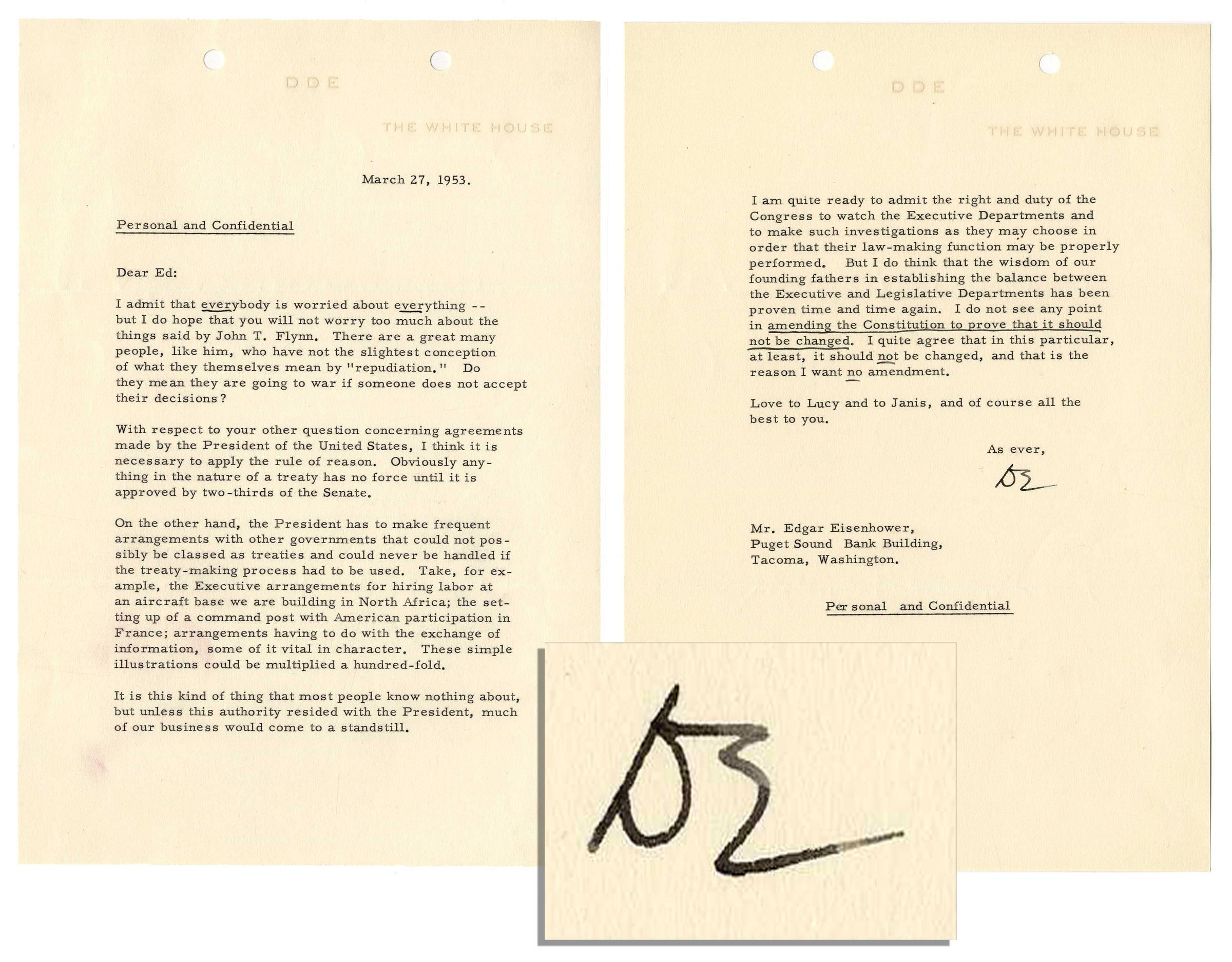 Dwight D. Eisenhower typed letter signed as President, dated 27 March 1953 on ''D.D.E. / The White House / Personal and Confidential'' stationery. Letter is addressed to Eisenhower's brother, Edgar, and discusses, among other topics, the importance of the balance of powers between branches of the government: ''…I admit that everybody is worried about everything -- but I do hope that you will not worry too much about the things said by John T. Flynn. There are a great many people, like him, who have not the slightest conception of what they themselves mean by 'repudiation.' Do they mean they are going to war if someone does not accept their decisions? With respect to your other question concerning agreements made by the President of the United States, I think it is necessary to apply the rule of reason. Obviously anything in the nature of a treaty has no force until it is approved by two-thirds of the Senate…I am quite ready to admit the right and duty of the Congress to watch the Executive Departments and to make such investigations as they may choose in order that their law-making function may be properly performed. But I do think that the wisdom of our founding fathers in establishing the balance between the Executive and Legislative Departments has been proven time and time again. I do not see any point in amending the Constitution to prove that it should not be changed. I quite agree that in this particular, at least, it should not be changed, and that is the reason I want no amendment…'' Signed ''DE''. Letter measures 7'' x 10.25'' on two pages with two holes punched at top and minor pinkish toned smudges on page one and certain sentences underlined, possibly by Eisenhower himself. Near fine.