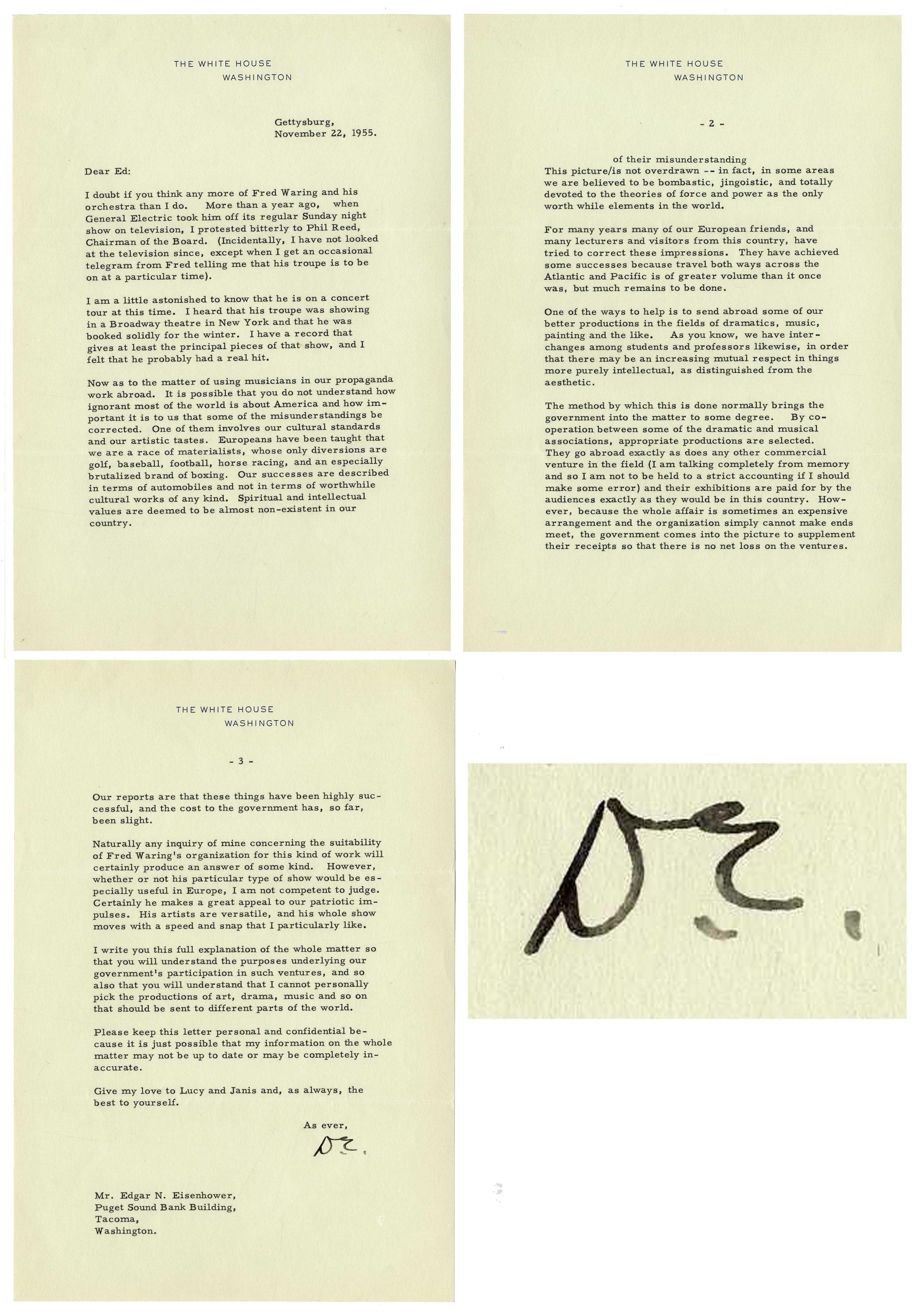 Dwight D. Eisenhower typed letter signed as President, dated 22 November 1955 on official White House stationery. Here, Eisenhower writes to his brother Edgar discussing the subsidization of American arts abroad: ''…Now as to the matter of using musicians in our propaganda work abroad. It is possible that you do not understand how ignorant most of the world is about America and how important it is to us that some of the misunderstandings be corrected. One of them involves our cultural standards and our artistic tastes. Europeans have been taught that we are a race of materialists, whose only diversions are golf, baseball, football, horse racing, and an especially brutalized brand of boxing. Our successes are described in terms of automobiles and not in terms of worthwhile cultural works of any kind. Spiritual and intellectual values are deemed to be almost non-existent in our country…This picture of their misunderstanding is not overdrawn -- in fact, in some areas we are believed to be bombastic, jingoistic, and totally devoted to the theories of force and power as the only worth while elements in the world. For many years many of our European friends, and many lecturers and visitors from this country, have tried to correct these impressions…One way to help is to send abroad some of our better productions int the fields of dramatics, music, painting and the like…because the whole affair is sometimes an expensive arrangement and the organization simply cannot make ends meet, the government comes into the picture to supplement their receipts so that there is no net loss on the venture…'' Signed ''D.E.'' in black ink. Letter measures 7'' x 10.25'' on three single-sided pages. Two minor folds from mailing, else fine condition.