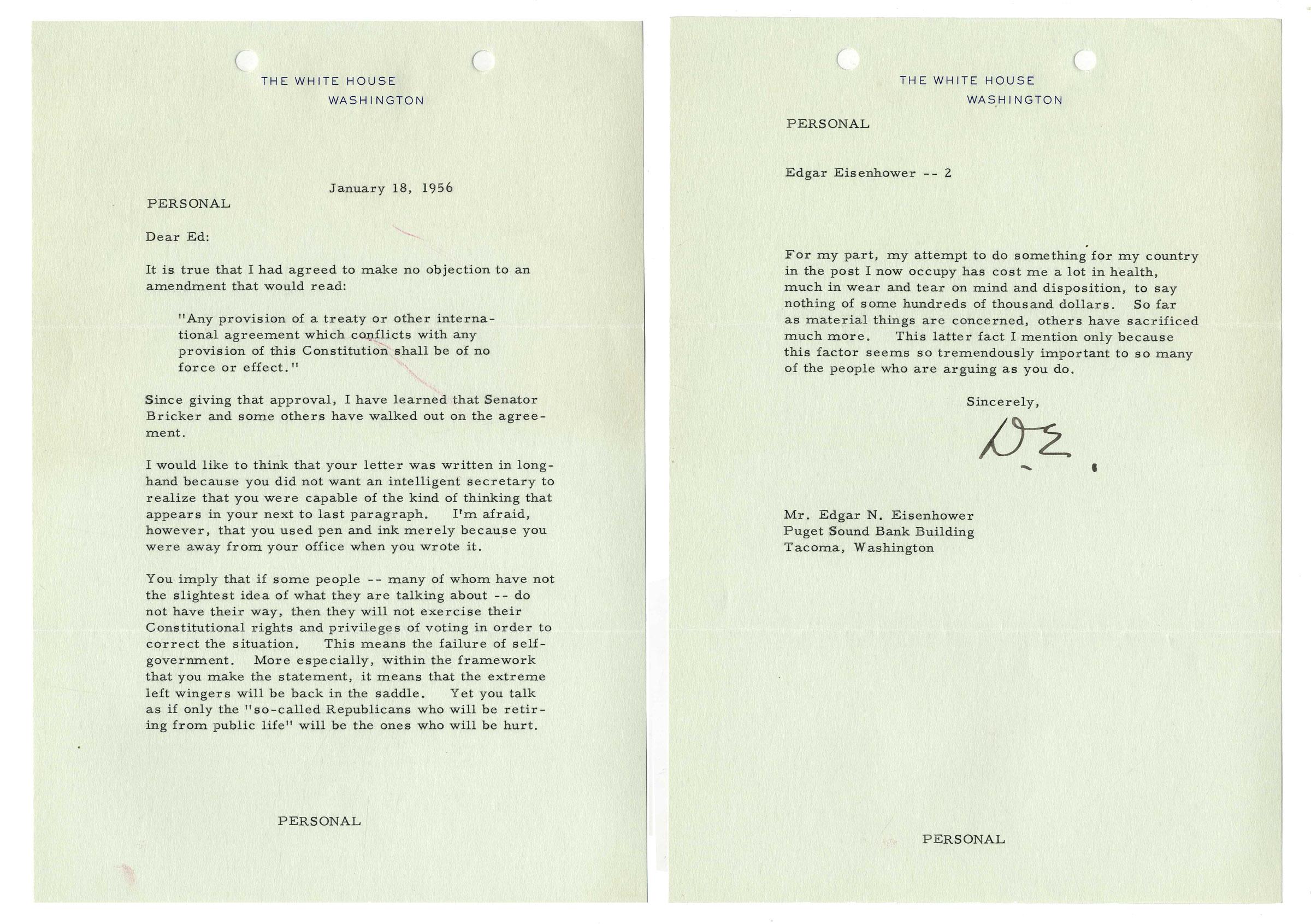 Dwight D. Eisenhower typed letter signed as President, dated 18 January 1956, on ''White House / Personal'' stationery. Here, Eisenhower writes to his older brother Edgar regarding the Constitution. Reads in part: ''Dear Ed: It is true I had agreed to make no objection to an amendment that would read: 'Any provision of a treaty or other international agreement which conflicts with any provision of this Constitution shall be of no force or effect.' Since giving that approval, I have learned that Senator Bricker and some others have walked out on agreement…You imply that if some people -- many of whom have not the slightest idea of what they are talking about -- do not have their way, then they will not exercise their Constitutional rights and privileges of voting in order to correct the situation. This means the failure of self-government. More especially, within the framework that you make the statement, it means that the extreme left wingers will be back in the saddle. Yet you talk as if only the 'so-called Republicans who will be retiring from public life' will be the ones who will be hurt. For my part, my attempt to do something for my country in the post I now occupy has cost me a lot in health, much in wear and tear on mind and disposition, to say nothing of some hundreds of thousand dollars. So far as material things are concerned, others have sacrificed much more. This latter fact I mention only because this factor seems so tremendously important to so many of the people who are arguing as you do.'' Signed ''D.E.'' in black ink. Letter measures 7'' x 10.25'' on two pages, with two holes punched at top and a faint line in red pencil. Near fine.