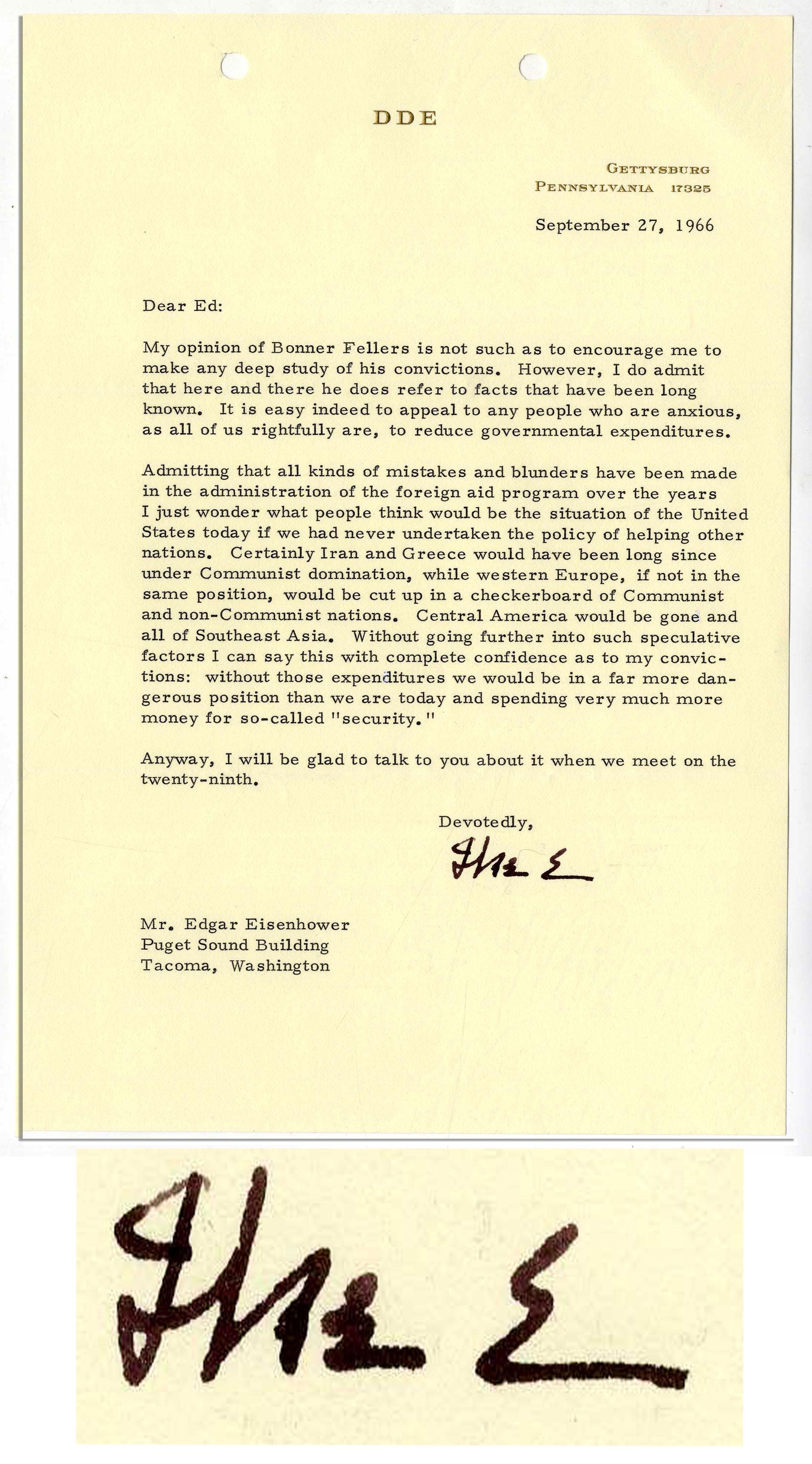 Dwight D. Eisenhower typed letter signed post-Presidency, dated 27 September 1966 on his personal letterhead. Here, Eisenhower writes to his brother Edgar on his foreign relations policies as President: ''…My opinion of Bonner Fellers is not such as to encourage me to make any deep study of his convictions. However, I do admit that here and there he does refer to facts that have been long known. It is easy indeed to appeal to any people who are anxious, as all of us rightfully are, to reduce governmental expenditures. Admitting that all kinds of mistakes and blunders have been made in the administration of the foreign aid program over the years I just wonder what people think would be the situation of the United States today if we had never undertaken the policy of helping other nations. Certainly Iran and Greece would have been long since under Communist domination, while western Europe, if not in the same position, would be cut up in a checkerboard of Communist and non-Communist nations. Central America would be gone and all of Southeast Asia. Without going further into such speculative factors I can say this with complete confidence as to my convictions: without those expenditures we would be in a far more dangerous position than we are today and spending very much more money for so-called 'security.' Anyway, I will be glad to talk to you about it when we meet on the twenty-ninth. Devotedly,'' and then signed ''Ike E'' boldly in black ink. Letter on one page measures 7'' x 10.25'' with two holes punched at top, else fine condition.