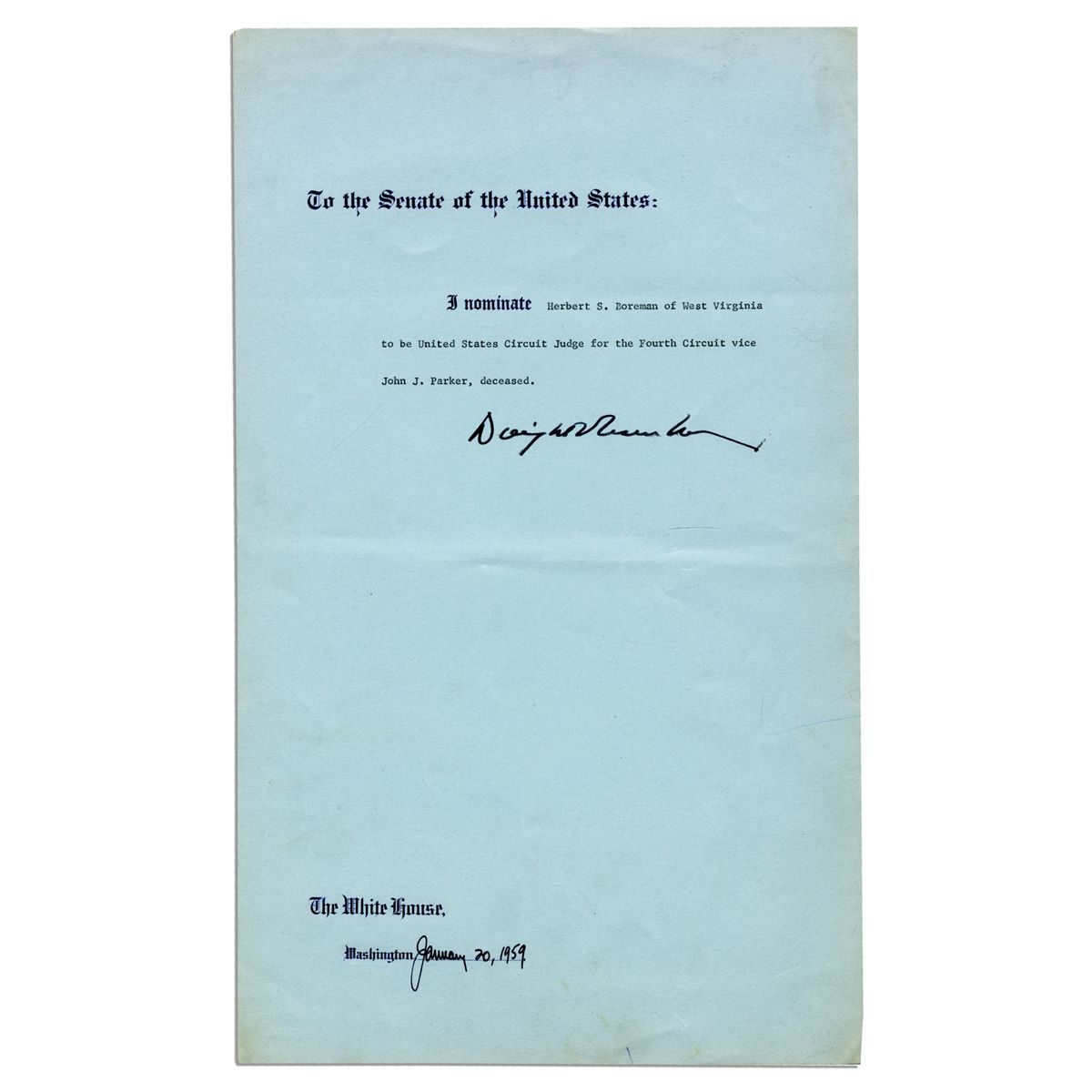Dwight D. Eisenhower WWII autograph letter signed as Commanding General of U.S. Forces in the European Theatre. On 6 April 1943, just one month before the successful close of Operation Torch, Eisenhower takes a break from commanding the Allied invasion of North Africa from his underground headquarters in Gibraltar to write his wife Mamie. In part: ''Darling...A letter today from General Allen says you may stay in S.A. [San Antonio, TX] all winter. I rather think he must be mistaken because Butch seems to have gotten no such idea. Butch says I've gotten fat, and in checking up on myself, I find he is right. We get plenty of fats & starches in our diet, and since I like them, the result is almost inescapable. Then I've had almost nil in the way of exercise. Also, Butch just told me that a radio man who has just arrived here from London says that I've aged at least 5 years since I left that city...I'll be something like the equivalent of 92 when I get back to the US...Mike tells me a recent letter of mine to her was cut to pieces by the censor. Sometimes I think all staff officers are without brains. I've never written a personal letter that could possibly violate sane censorship - If Mike still has a the d--- thing, please ask her to send it back to me. I'd just like to check. Actually I lean over backward to avoid violations in that regard. The d--- fool censors should honor that (if I so choose) I could send all my letters to the WD for transmission, because I, Not the censors, carry the responsibility for the safety of this command. Well sweet, I rack my head for news in which you might be interested. Concerning operations I can tell you nothing you have not already seen in the papers...This is the worst place in which to try to write a letter! I get so weary of interruptions I feel like putting a padlock on the door. But I try to keep a good disposition. Give all the family my love. If I had a phone that could go to S.A. in one long hop, d--- if I couldn't take off from here one day & pay you a visit, if only for 5 minutes. Don't forget me, because, with all my faults, my age, my fat, I surely love you!!! Your Ike''. Original mailing envelope is included, where Eisenhower writes ''Censored by: Dwight D. Eisenhower / General U.S.A.'' Postmarked 21 April 1943. 3pp. letter on 3 separate sheets of ruled stationery measures 8'' x 10.5''. Toning, else near fine.