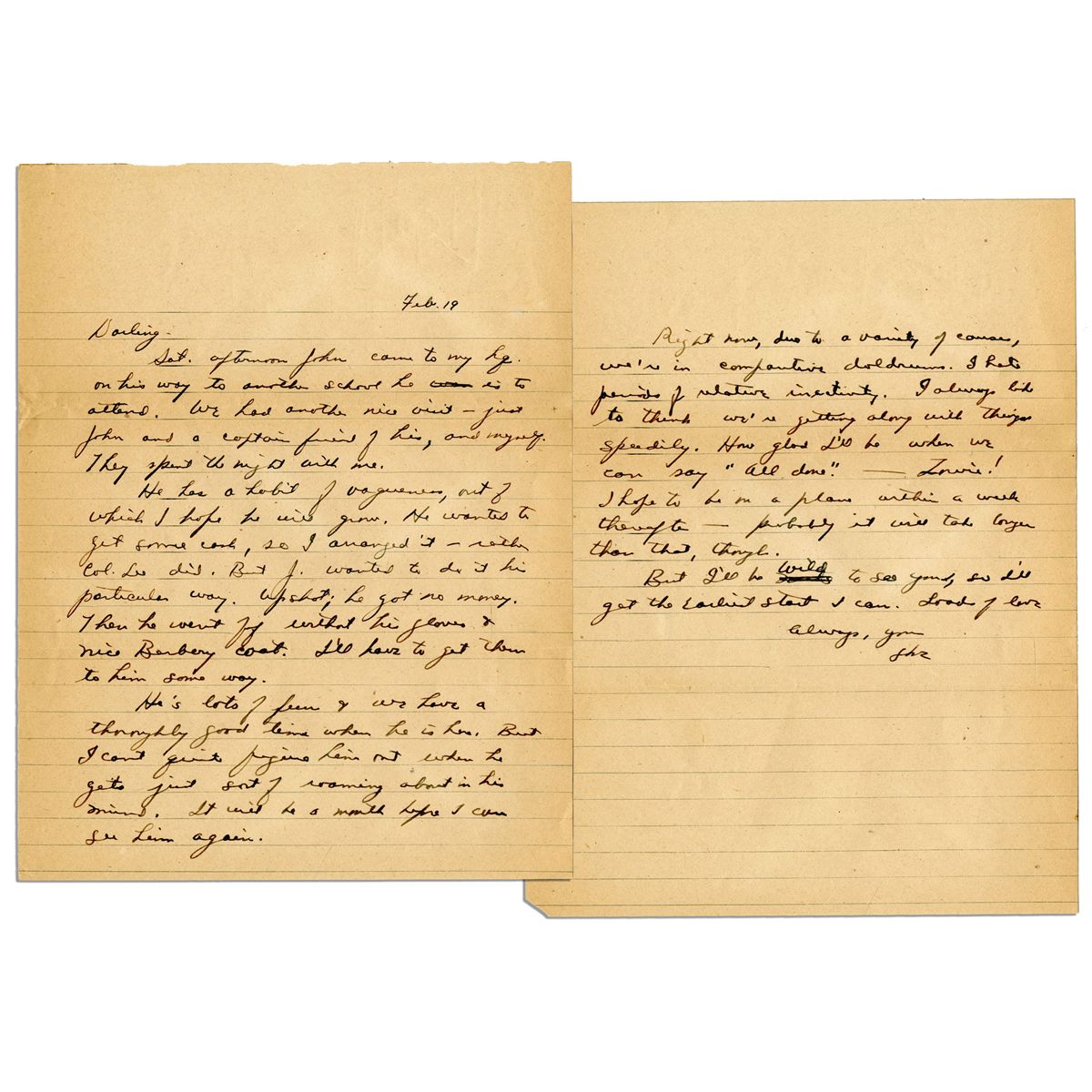 Dwight D. Eisenhower WWII autograph letter signed to his wife Mamie. Dated simply 28 August, it reads in part: ''My darling...one of my troubles is the physical discomfort I suffer in trying to wield a pen...I was glad to see by your latest latter that you did get in a visit with Whitely & Gault. They are fine men!...If my hand keeps hurting I'm going to learn to write with my teeth. I have had no recent letter from [son] John. His summer was certainly a busy one, and I know he enjoyed it thoroughly. I sent him several messages praising the Field Art, so it looks as if he's go into the infantry. My advice was apparently not in line with his own ideas. Well, it's his life - so that's that!...T.J. was out to see us the other eve. We had a movie at our house, and I did something I should have done long ago; I asked out all the WAC officers that came with the original crowd. There were 3 men and a dozen women. I'll bet it's the first time in this theater that there were more women than men at any gathering of that sort. Gave them a buffet supper - movie - all out of the house by 10:45 & Butch and I in bed by 11:00. Not so bad as the movie was fairly funny. Bob Hope. By the way, he came here to see me the other day. Seems a more attractive person to me off the stage than on it. I'm no Hope fan so far as the movies are concerned, but he's done a grand job here in entertaining soldiers - including those in Sicily. I believe he has been the favorite of the soldiers...Lots of love to you - and for Lord's sake don't limit your thinking of me to the occasion when you happen to hear somebody is starting a flight in this direction. I love you, all the time. Always your / Ike''. 3pp. letter on ruled stationery measures 8'' x 10.5''. Creasing, else near fine.