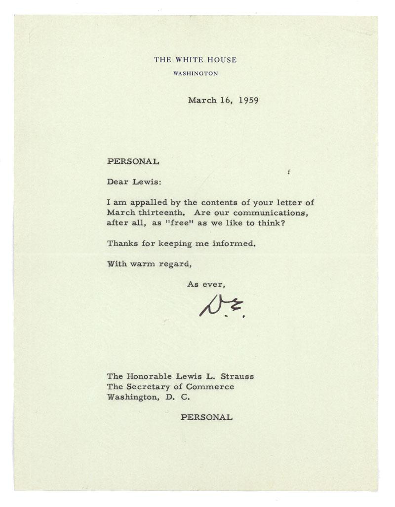 TLS 1 page 6 ¾” x 9”. On imprinted White House Letterhead. To Secretary of Commerce Lewis L. Strauss. Dear Lewis: I am appalled by the contents of your letter of March thirteenth. Are our communications after all, as “free” as we like to think?” Initialed at he conclusion of the letter. “D.E.” An interesting letter raising question concerning privacy issued within the government during the 1950’s. One center fold. Excellent.