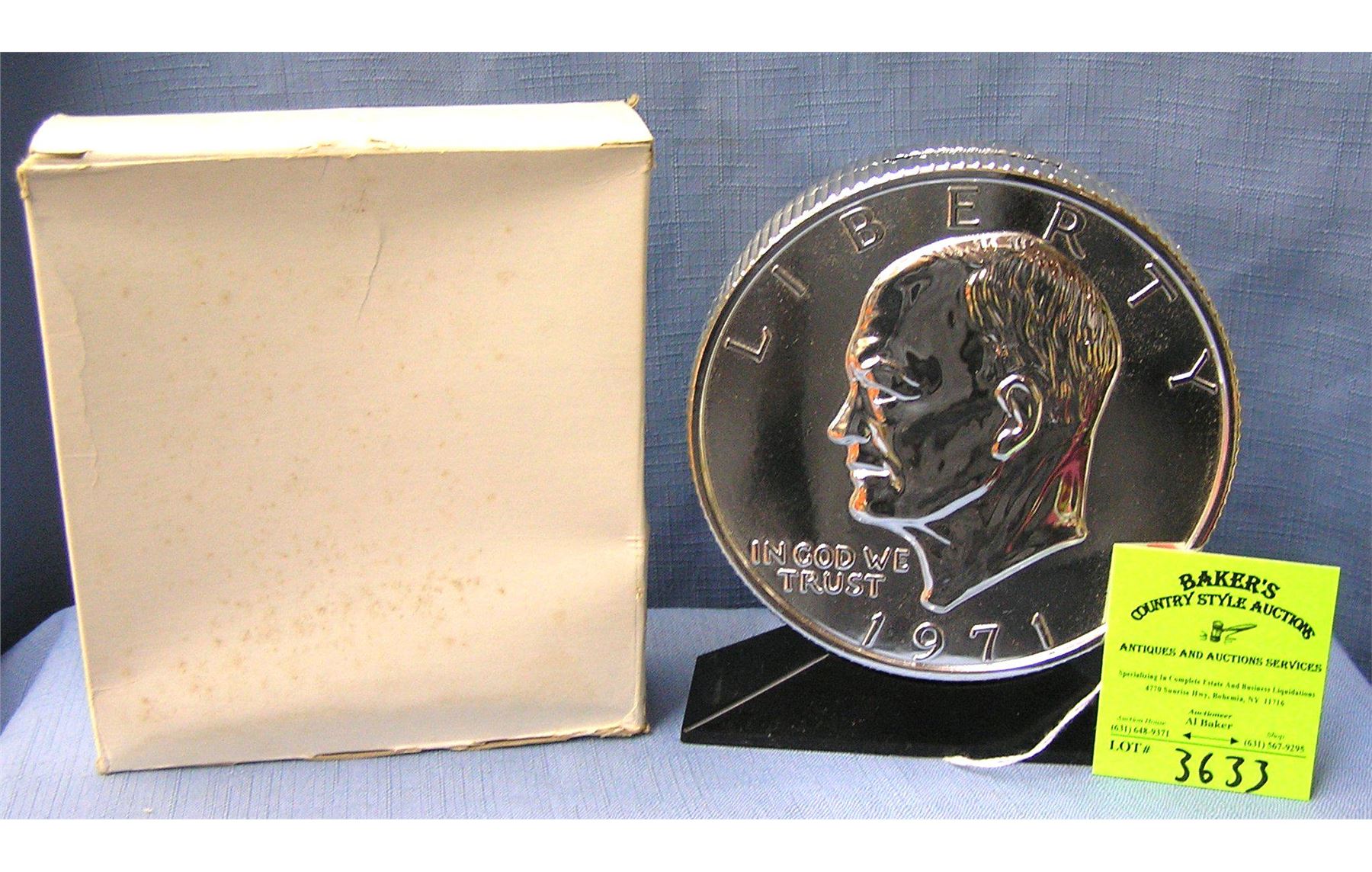 Vintage cast metal Eisenhower dollar coin bank in original box est. value $75.00-$95.00