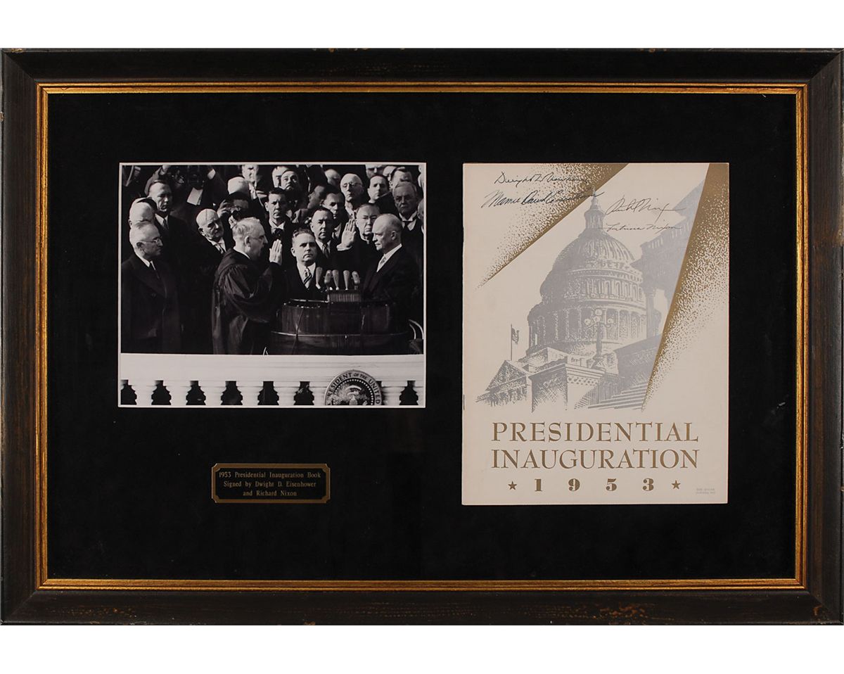 Program for the 1953 presidential inauguration, 8.5 x 11, signed on the front cover in fountain pen by Dwight D. and Mamie Doud Eisenhower, and black ballpoint by Richard and Patricia Nixon. Beautifully matted and framed with a photo of Eisenhower’s swearing-in to an overall size of 26.75 x 18.25. In fine condition. Accompanied by a full letter of authenticity from PSA/DNA. Oversized.