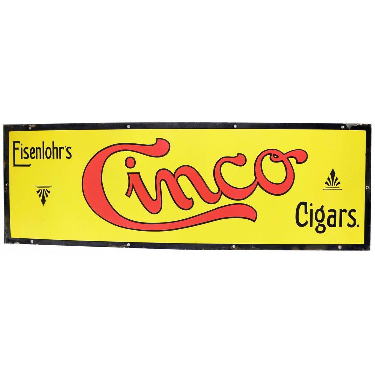 Eisenlohr's Cinco Cigars Porcelain Sign. Some minor edge ware otherwise very good condition. 36 X 12 inches.