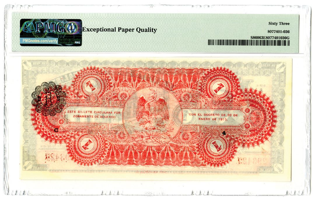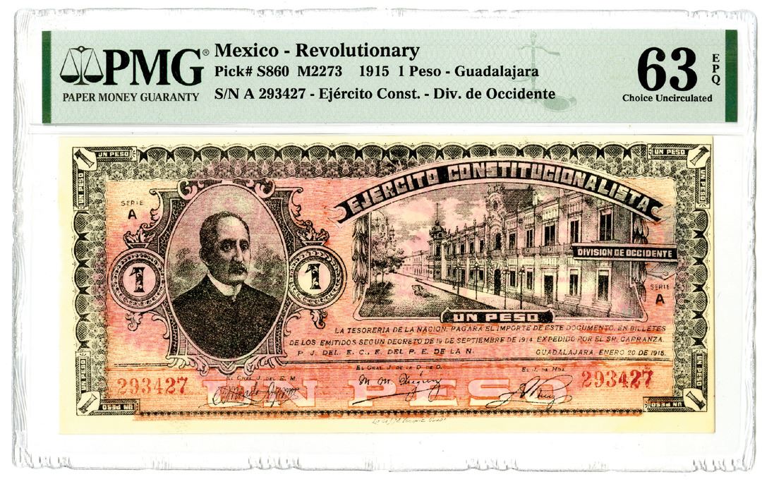 Mexico - Revolutionary. 1915. 1 Peso - Guadalajara, P-S860 M2273, Issued banknote, Black on multicolor, S/N A 293427 - Ejercito Const. - Div. de Occidente, PMG graded Choice Uncirculated 63 EPQ. This note is the highest graded out of 4 graded in the PMG census.