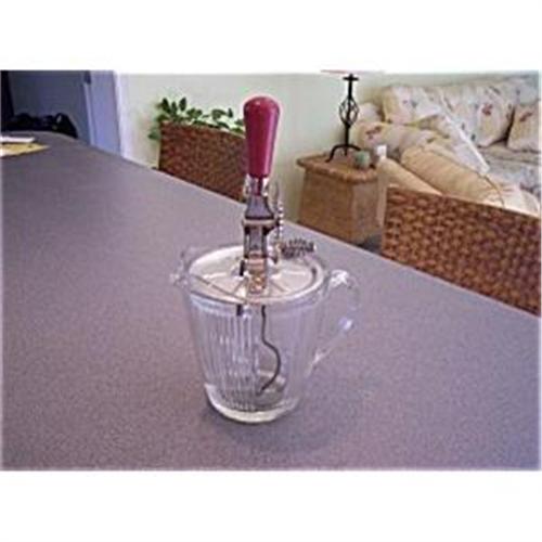 This is an A&J red handle beater jar. It's all original. I don't think the handle was repainted but I could be wrong. There's no chips or cracks to the jar which is about 5.75" tall. There is metal wear to the top of the beaters in one spot. These are great for whipping up eggs for omelets. So if you've been wanting one of these, now's your chance!!<BR>