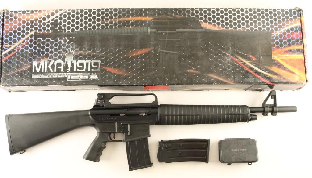 Turkish semiautomatic shotgun, imported by RAAC, Scottsburg IN. Has a very similar appearance to AR15 style rifles. Features 19.7" barrel with removable choke tube (cylinder installed), detachable 5 round magazine (two included), front post and adjustable peep rear sights, sling swivels, manual safety. Bore is excellent. Metal and polymer parts all excellent with few signs of handling. Includes original factory cardboard shipping box, manual, spare magazine, plastic case with additional choke tubes (Full, Modified - manual explains how to identify each choke) and tube wrench. Condition is NRA Excellent - Like New *** Modern Firearm ***
