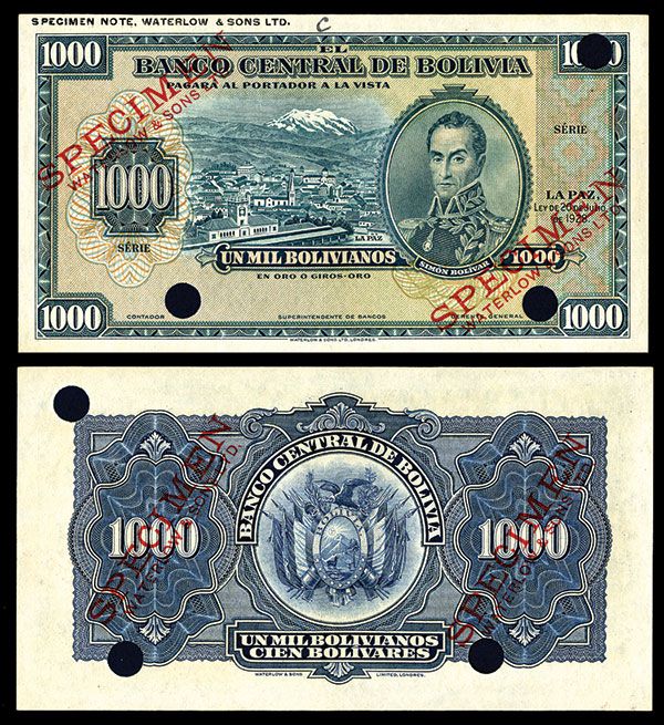 La Paz, Bolivia, 1928. 1000 Bolivianos. P-135 Unlisted Color Trial, Dark green on m/c instead of issued rose on yellow and light blue underprint, Diagonal “Specimen - Waterlow & Sons” overprints on upper left and lower right on face and back, Bolivar on right, La Paz in middle, POC's. Choice uncirculated condition. Scarce Waterlow color trial. W&S.