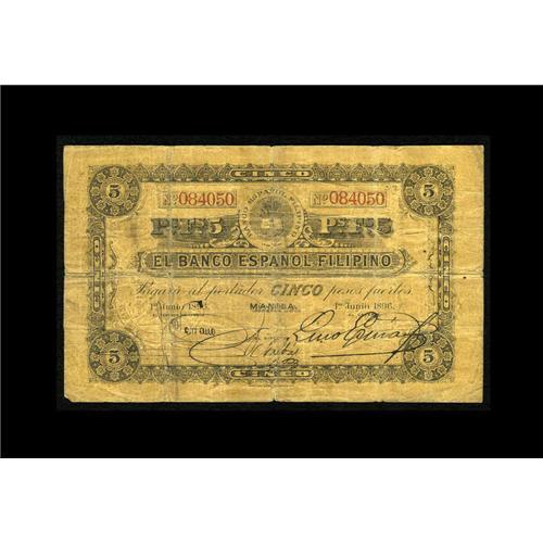 El Banco Espanol Filipino 5 Pesos June 1, 1896 Pick A7 Philippines
