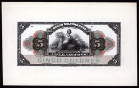 ND (ca.1920). 5 Colones. P-S213p. Proof face with no back. Printed on india paper on large card. Black and m/c. Allegorical woman with sheaf of wheat in middle. No serial numbers or date. Unc. to CU. ABNC. Scarce note.