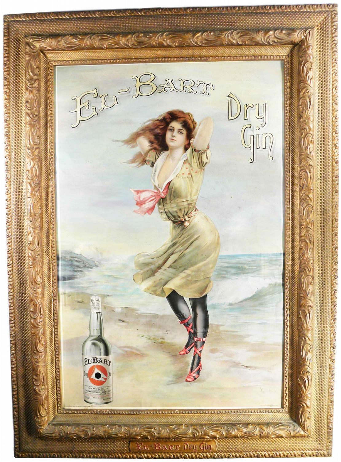 El Bart Dry Gin Tin Sign in original gesso frame. Kaufmann & Strauss Co., NY Lithographer. Copyright 1905 by the Wilson Distilling Company, Baltimore, MD. Small edge wrinkles at 10/12/3:00 and professional restoration to background and left elbow.