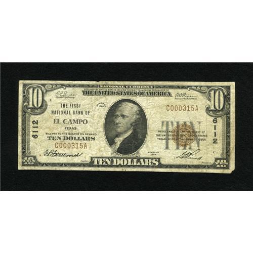<B>El Campo, TX</B></I> - $10 1929 Ty. 1 <B>The First NB</B></I> Ch. # 6112<BR>This one-bank community is seldom seen in any grade. <B>Very Good-Fine</B></I> with a tiny chip out of the bottom right corner.<BR><BR><b>Shipping:</b> Coins & Currency (<a target="_blank" href="http://www.heritageauctions.com/common/shipping.php">view shipping information</a>)