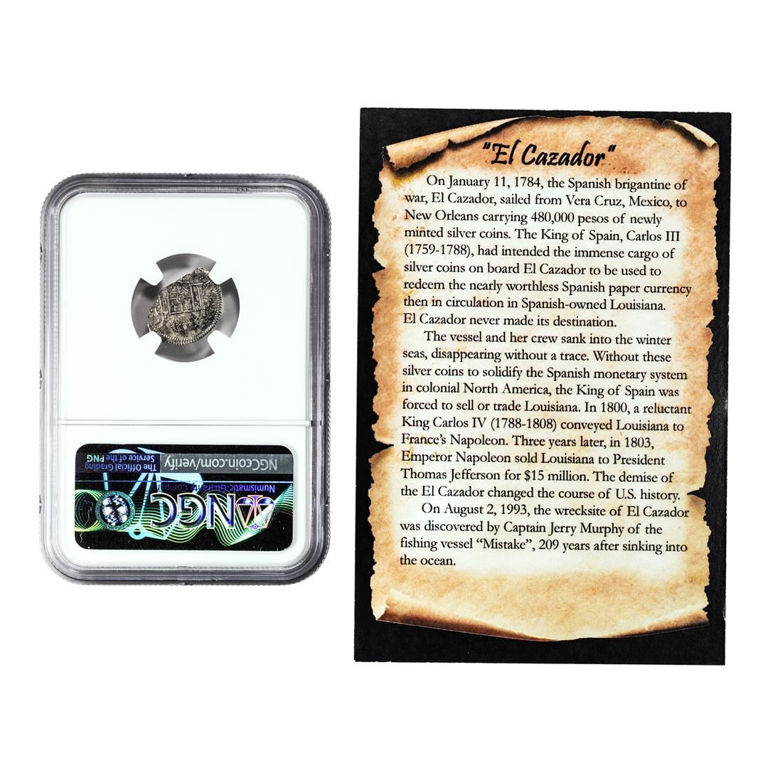 El Cazador Shipwreck (1772-83) Mexico 1/2 Real Silver Coin NGC Genuine w/ Story Card
